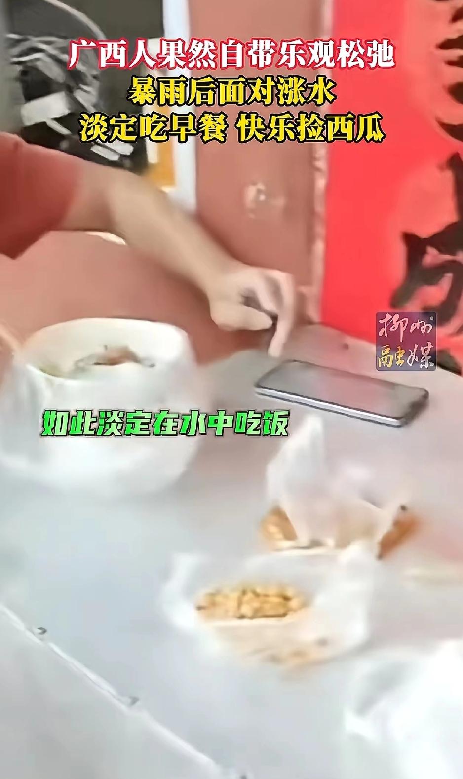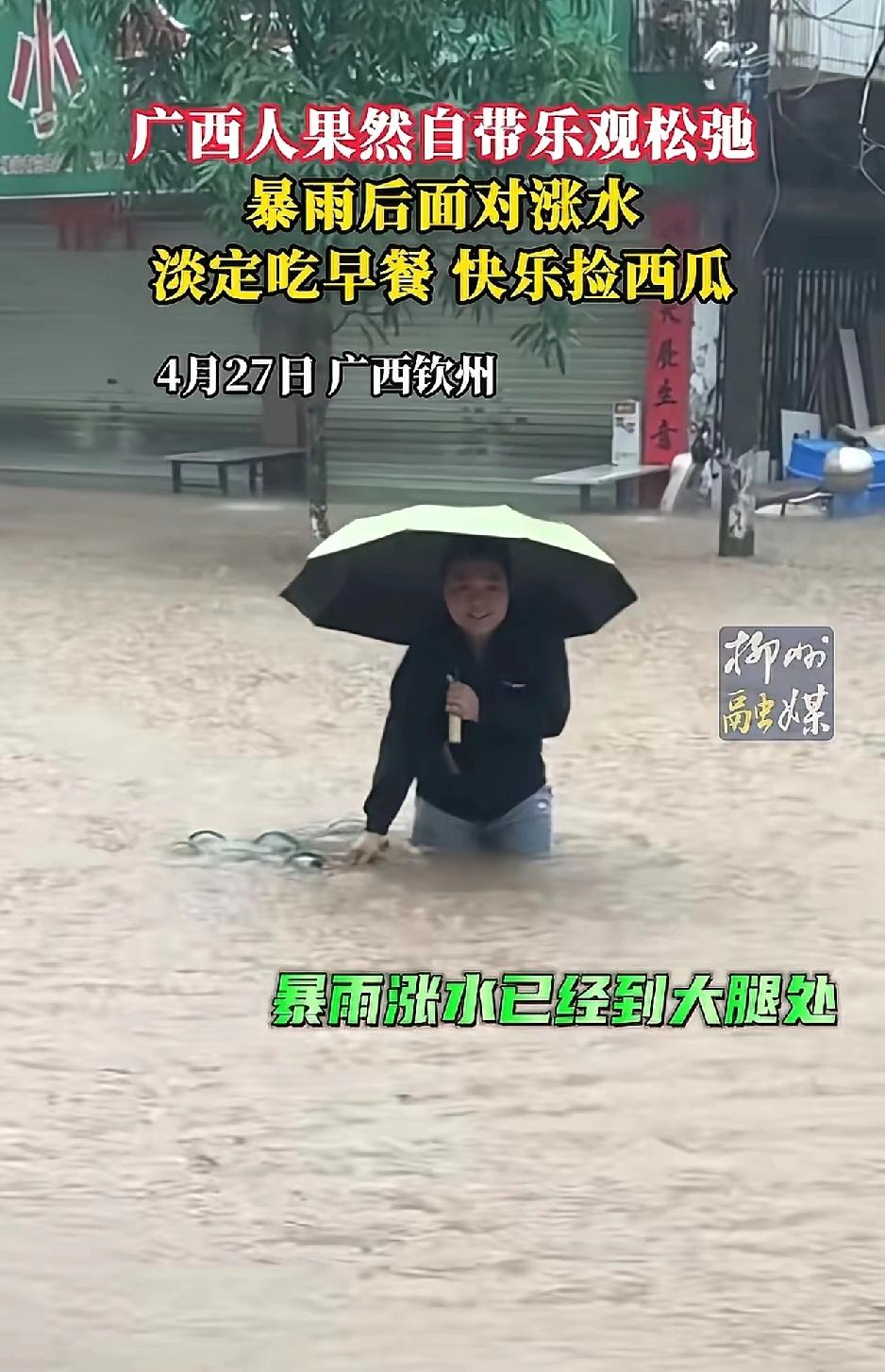 “水淹到大腿还在捡西瓜”,这就是广西人天生自带的松弛感!这几天,广西钦州连日暴雨,水涨到大腿根了。 可你猜当地人在干嘛? 不是慌慌张张地搬家、不是愁眉苦脸地抱怨。老板淡定地拿筐去拾“离家出走”的西瓜,小孩一手打伞一手抱瓜,笑嘻嘻地跟玩似的。 有人在屋里下身泡着水、凳子漂着,上身纹丝不动,边刷手机边享受丰盛的早餐。还有人开游船、骑电动车,该干嘛干嘛。 一点不受影响。 不,应该说——受影响了,但无所谓。 01 不是不苦,是“苦也没用” 换成外省人,大概率早就炸锅了:骂天气、骂排水、骂物业、骂老公。 广西人不。他们的逻辑很简单:雨已经下了,水已经涨了,骂有用吗?没用。那不如该吃吃、该喝喝、该捡西瓜捡西瓜。 这不是麻木,这是在不可抗力面前,选择了最省电的活法。 02 松弛感,不是装的 有人说:那是他们习惯了。对,就是习惯了。 习惯了天灾躲不过,习惯了生活总有意外,习惯了哭也一天、笑也一天。与其愁眉苦脸地等水退,不如笑嘻嘻地捞西瓜。 他们的淡定,不是不在乎,是太知道“在乎也没用”。 03 这种心态,其实是本事 我们总说“情绪稳定”,广西人是“情绪稳如老狗”。 暴雨来了,你慌,你的世界就塌了。他不慌,他的世界照常运转。水淹到大腿,他还能坐下来吃早餐——这份定力,比多少心理课都管用。 我是飞鱼,滨海小城,下班后做自媒体创业者。 广西人的松弛感,我学了一年。不是不焦虑,是学会了:能解决的事,不用焦虑;解决不了的事,焦虑也没用。 你遇到突发状况时,是“炸锅型”还是“捡西瓜型”? 评论区说说,你的“松弛感”修炼到第几层了?