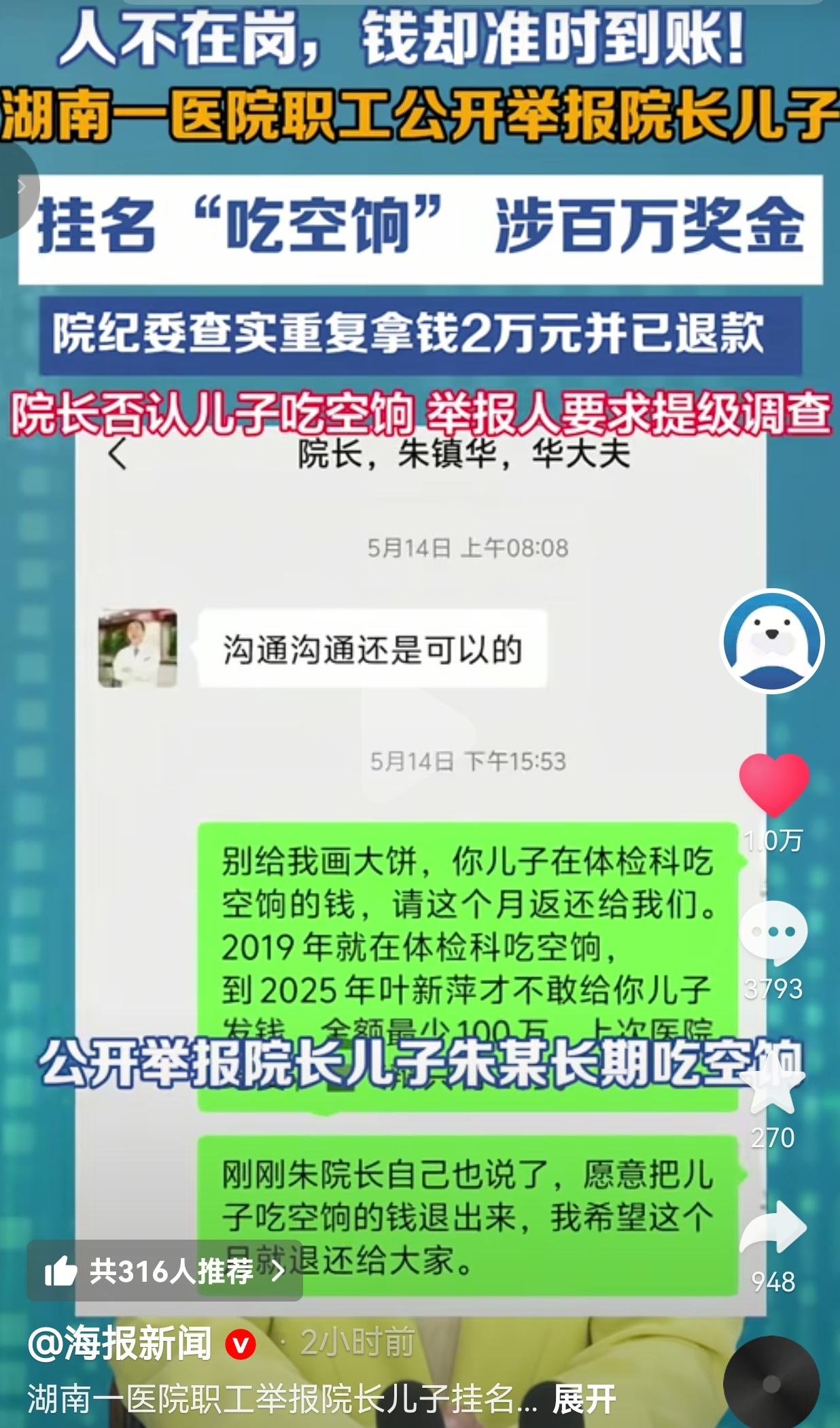 人不在岗,工资奖金照拿不误?湖南这家医院“吃空饷”,真让人火大 谁能想到,从2019年到现在,整整6年时间,有人编制挂在科室,人却常年不在岗,可工资、奖金、各项福利照样一分不少领到手,举报人粗略估算,涉及金额甚至可能超百万。 这事就发生在湖南中医药大学第一附属医院,院内职工陈女士,直接实名举报院长朱镇华的儿子朱某,长期挂名“吃空饷”。 据陈女士反映,朱某的编制明明落在医院健康管理科,可自打入职以来,他压根没在这个科室上过一天班,长期被借调去其他科室工作。 但这6年里,健康管理科的季度奖金、节日福利、各类补贴,他全都照单全收,从来没落下过。 看着这种不公之事,身为老职工的陈女士实在忍无可忍,直接找到院长朱镇华当面讨要说法,可对方只是轻飘飘回了一句“沟通沟通还是可以的”,完全没把这事放在心上。 陈女士压根不吃这种敷衍的态度,当场在微信里放话:“别给我画大饼,你儿子在体检科吃空饷的钱,请这个月返还给我们!” 更让人觉得心寒又震惊的是,此前陈女士同样实名举报该科室主任,称其巨额财产来源不明,涉事主任很快就被停职处理。 可轮到院长儿子这件事,院纪委介入调查后,最初只认定朱某存在2万元重复拿钱的问题,且钱款已退还,之后便再无任何后续进展。 直到舆论迅速发酵、学校调查组介入,才将金额更正为借调期间重复发放绩效奖金8.4万元,并要求退还,但截至目前,医院依旧没有发布完整的官方通报。 对于这样的处理结果,陈女士完全不认可,她始终坚持要求省纪委介入,彻查这6年来的全部资金流水;而院长朱镇华,却一口否认了儿子“吃空饷”的说法,双方各执一词。 网友看到后评论说: “好家伙,儿子挂个名就能安安稳稳领6年钱,普通职工累死累活拼业绩还动不动被扣钱,这区别对待也太明显了!” 也有的网友说:“一开始查半天就查出2万,没过多久又变成8.4万,那6年里到底还有没有没查清的钱?这调查也太糊弄人了!” 还有的网友说:“举报科室主任立马就停职,到了院长儿子这就大事化小,同样是实名举报,处理标准也太双标了!” 更有网友表示: “医院的每一分钱都是患者的救命钱、纳税人的血汗钱,凭什么用来养这种不干活的关系户?太过分了!” 说句实在的,看完整件事,我心里的火气压根压不住。 最让人窝火的,从来不是简单的重复拿钱这件事,而是这种明目张胆的特权做派,还有双标到极致的处理方式,实在让人难以接受。 普通医护职工,偶尔迟到早退要扣钱,工作业绩稍不达标就要被约谈问责;科室主任被举报,立马依规停职接受调查。 可轮到院长儿子,人不在岗整整6年,躺着拿钱拿到手软,最初调查只揪出2万的小问题,典型的“罚酒三杯”,后续才勉强更正为8.4万。 这6年间,到底还有没有其他未查清的补贴、福利,从头到尾都没人给公众一个明确说法。 其实陈女士执意举报,要的从来不是自己分得一分钱,她要的只是一个公平,一个普通人在职场里、在规则面前该有的公道。 可现实却让人无奈,这份本该人人平等的公道,在权力面前,竟显得如此微不足道。 医院是救死扶伤的净土,是老百姓掏出血汗钱寻求生机的地方,这里的每一分钱,都该用在患者救治上、用在坚守岗位的医护人员身上。 可偏偏被这种挂名不干活的关系户侵占,不仅寒了所有踏实干活医护人员的心,更伤了万千患者对医院的信任。 更让人后怕的是,如果这件事最后就以“退还钱款”草草了事,那以后还有谁敢站出来实名举报不公之事?谁还能相信调查能做到一碗水端平?当规则只用来约束无权无势的普通人,对有关系有背景的人一路开绿灯,这才是最让人心寒绝望的事。 我始终坚信,制定规则的意义,就是让所有人都能站在平等的起跑线上,不分身份、不看背景。如果规则只用来捆绑弱者,却对特权百般纵容,那再完善的制度,也不过是一张毫无用处的废纸。 真心希望相关部门能彻查到底,给执着维权的陈女士一个彻底公正的结果,也给所有被寒了心的普通人,一个实实在在的交代。 别让少数“吃空饷”的蛀虫,一点点啃食掉大家对公平正义的最后期待。 对事严一点,对特权零容忍,才是真正的公道。 信息来源:海报新闻
