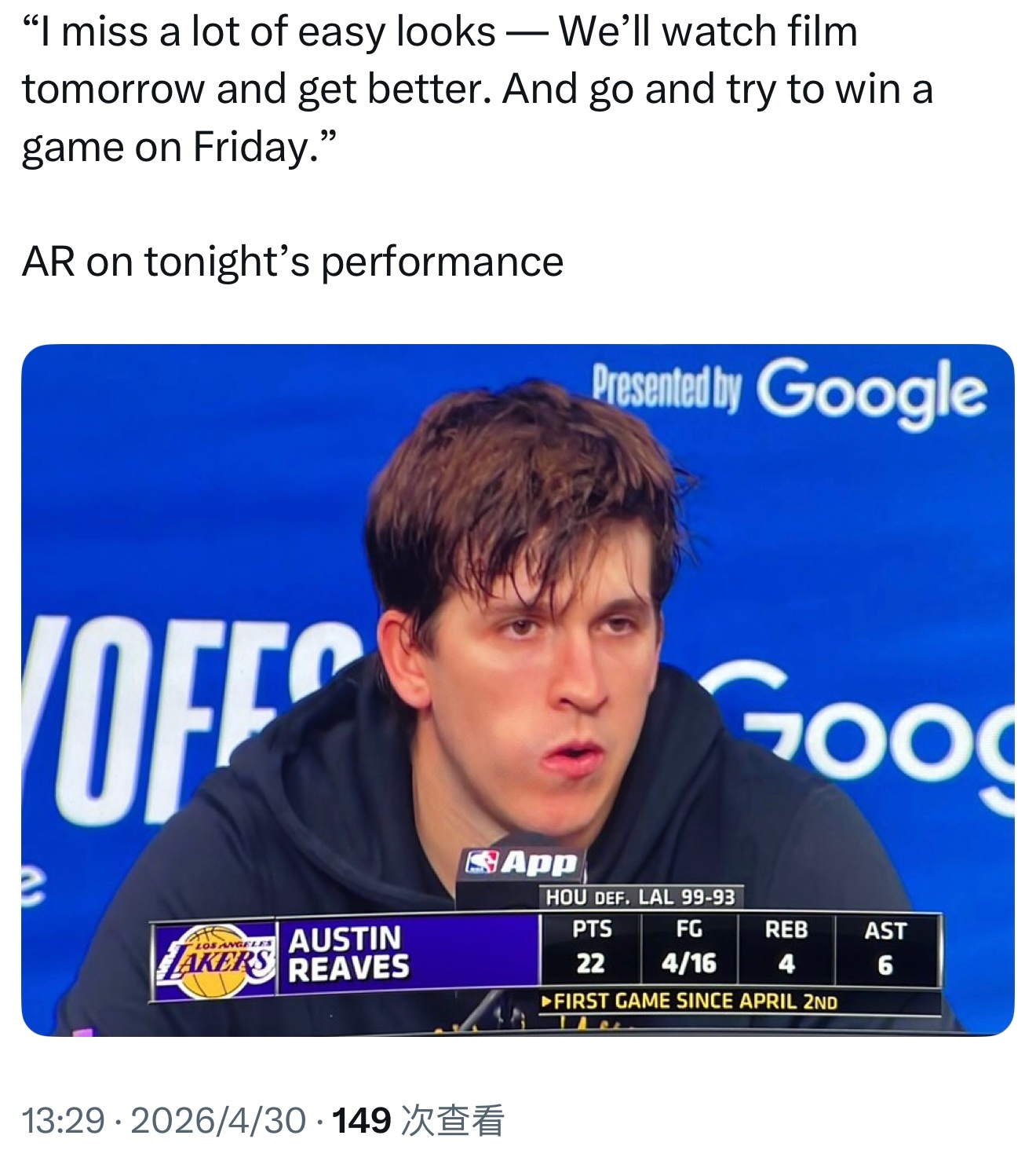 “我错失了很多轻松的得分机会——我们明天会看录像,变得更好。然后去争取在周五赢下一场比赛。”