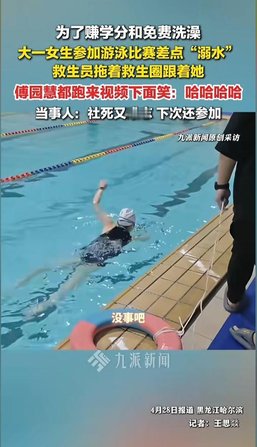 “为了学分也是拼了!”4月28日报道,黑龙江哈尔滨,一位大一女生为了拿学分,报了游泳比赛。可她就学过10个小时的自由泳,只能够游25米。比赛过程中,她差点溺水,旁边救生圈吓坏了,拿着救生圈一直跟着!网友:社死又难忘! 据媒体报道,这名女生听导员说,报名游泳比赛可以加学分,还能够免费洗澡,她一听就心动了,果断报了名。她以前学过自由泳,但只学了10个小时,自己的水平也就能游25米,跟比赛要求的50米差一半呢。 不过,她从一开始就想好了,自己不求快,只求稳,只要能慢慢游完全程,自己就胜利了,就可以加分。但理想很丰满,现实很骨感,当她游了一半,开始返程的时候,就没有体力了。 返程刚游了几米,她就累的抓住了岸边,还差点溺水。旁边的救生员拿着救生圈就过来了,问她需不需要帮助。女生拒绝了。她自己一个人强撑着,游上几米就扶着歇一会儿,救生员吓得从后面全程跟着。 在女生的坚持下,她终于独自游完了全程,顺利获得了成绩。上岸后,同学们纷纷给她鼓掌祝贺。虽然自己是最后一名,但在她的助力下,学员总成绩反而拿了第一,她也拿到了一个奖杯!她还说下次还要继续参加呢! 网友看后表示,这大概就是E人和I人的区别吧,这么社死的场面,要是搁I人身上,早就害怕的晕过去了! 信息来源:《4月28日报道,黑龙江哈尔滨。