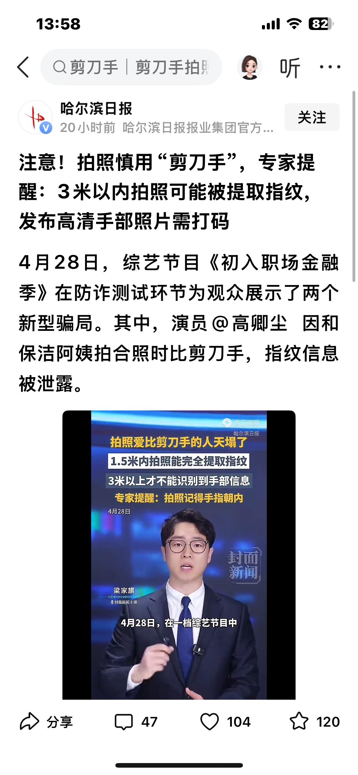 剪刀手拍照竟泄指纹!新型骗局防不胜防,你的随手一拍都是隐患 注意!拍照慎用“剪刀手”,专家提醒:3米以内拍照可能被提取指纹,发布高清手部照片需打码 4月28日,综艺节目《初入职场金融季》在防诈测试环节为观众展示了两个新型骗局。其中,演员@高卿尘 因和保洁阿姨拍合照时比剪刀手,指纹信息被泄露。 这场看似综艺效果的测试,实则撕开了当下个人信息泄露的隐秘缺口,也给所有爱拍照、爱发社交动态的人敲响了警钟。谁能想到,我们日常拍照最常用、最下意识的剪刀手姿势,竟会成为泄露个人核心生物信息的突破口。 节目里的防诈测试全程还原了诈骗分子的作案手法,看似普通的合照,只要拍摄距离在3米以内,高清镜头能清晰捕捉到手指纹路,不法分子就能借助专业图像修复技术、指纹提取软件,将照片里的指纹完整还原、精准提取。整个过程无需复杂设备,也不需要近距离接触,仅凭一张高清照片,就能轻松获取他人独一无二的指纹信息。 演员高卿尘全程无意识,只是配合拍摄比出剪刀手,自己的指纹就被悄无声息窃取,而扮演保洁阿姨的工作人员,正是利用这一漏洞,轻松完成了这场“信息窃取骗局”。测试结束后,在场嘉宾无不震惊,谁都没料到,个人指纹这种极具唯一性、保密性的生物信息,会以这么简单的方式被泄露。 要知道,指纹作为人体独有的生物特征,是如今身份验证、财产安全的核心屏障。手机解锁、移动支付、门禁通行、文件签署、政务办理,几乎都离不开指纹验证,它等同于我们的“数字身份证”,一旦落入不法分子手中,后果不堪设想。 诈骗分子拿到完整指纹信息后,既能通过技术手段制作指纹膜,破解各类指纹锁、支付验证,窃取个人财产、隐私信息;也能将指纹信息打包贩卖至黑色产业链,用于各类违法犯罪活动,而信息被泄露的当事人,往往在毫不知情的情况下,陷入财产损失、身份被冒用的险境。 更让人揪心的是,绝大多数人对此毫无防范意识。出门旅游、朋友聚会、日常打卡,随手比出剪刀手拍照,拍完立刻原图发送社交平台,从未想过高清照片背后的风险。大家只在意照片好不好看,完全忽略了手部指纹、面部特征等生物信息的安全,给了不法分子可乘之机。 有专业网络安全专家多次发声,如今图像修复技术愈发成熟,哪怕是普通智能手机拍摄的高清照片,只要指纹纹路清晰,提取成功率极高,3米之内的拍摄距离,几乎毫无隐私可言。可这类专业提醒,始终被大众当成耳旁风,直到综艺测试曝光,才让众人看清风险。 这种新型信息窃取骗局,比传统电信诈骗更隐蔽、更难防范。它没有诈骗电话、没有钓鱼链接,只是利用大众的日常习惯,悄无声息收集信息,让人防不胜防。而防范这类骗局,从来没有复杂技巧,核心就是改掉随手发原图、随意暴露手部纹路的习惯。 无论是和他人合照,还是拍个人照片,但凡涉及手部特写、剪刀手姿势,发布前一定要对手部进行打码模糊处理;尽量避免在3米以内拍摄高清手部照片,更不要随意将原图发送给陌生人;涉及指纹、面部、虹膜等生物信息,时刻保持警惕,毕竟个人信息安全,从来都容不得半点马虎。 科技发展带来便利的同时,也滋生了新型安全隐患,我们享受拍照分享的快乐时,更要守住个人信息安全的底线,别让随手一拍,变成伤害自己的利器。 各位读者你们怎么看?欢迎在评论区讨论。
