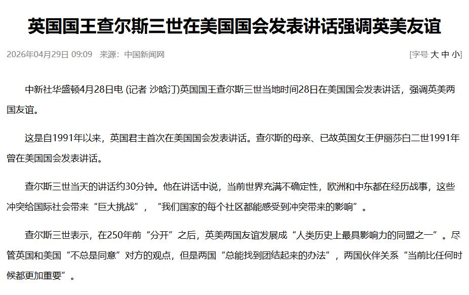 太敢说了!英国国王直接杀到美国国会,当着全美国议员的面,公开敲打美国总统特朗普!4月28日这场轰动全美的演讲,表面全是客客气气的场面话,背地里全是招招见肉的硬刀子,直接把特朗普的外交底牌掀了个干净。 查尔斯这老头,今年都77岁了,当了70多年的王储,什么大风大浪没见过?他从冷战时期就开始参与国际事务,跟里根、撒切尔夫人这些老牌政治家打过交道,见识过真正的国际政治博弈。 特朗普呢?虽然年纪也不小,但政治资历跟查尔斯比起来,那真是小巫见大巫。查尔斯这次访美,是他当上国王后第一次对美国进行国事访问,选择在美国国会演讲,这本身就是一种政治姿态。 演讲内容更有意思。查尔斯说当前世界充满不确定性,欧洲和中东都在经历战事,这些冲突给国际社会带来“巨大挑战”。这话听起来像是老生常谈,但结合最近特朗普的所作所为,就能听出弦外之音。 就在演讲前一个月,特朗普还在威胁欧洲国家,要求他们加入所谓的“霍尔木兹联盟”,帮着美国管控霍尔木兹海峡,否则就停止向乌克兰提供武器。这种赤裸裸的交易式外交,在查尔斯这种老派政治家眼里,简直幼稚得可笑。 查尔斯在演讲中特别强调:“无论我们有什么分歧,我们都将团结一致捍卫民主”。这话说得漂亮,但明眼人都知道是在敲打谁。特朗普最近干了什么?4月1号接受英国《每日电讯报》专访时,他公开说正在“认真考虑”让美国退出北约,还把北约称为“纸老虎”。 4月26号,也就是查尔斯演讲前两天,特朗普又在福克斯新闻网上抱怨,说北约“不服务于美国利益”,美国为北约“服务很多年”,耗费数万亿美元,当美国需要帮助时,他们却“站在一边看”。这种斤斤计较、睚眦必报的做派,在查尔斯看来,完全不是大国领袖该有的气度。 查尔斯还说了句更狠的话:“我全心全意地祈祷,我们将继续与我们在欧洲、英联邦和世界各地的伙伴一道捍卫我们的共同价值观,不要理会那些要求我们更加向内看的呼声”。这“更加向内看”指的是什么?不就是特朗普的“美国优先”政策吗?查尔斯这话说得委婉,但意思再明白不过:别搞孤立主义那一套,国际政治不是这么玩的。 查尔斯怎么谈乌克兰问题。他说要实现“真正公正且持久的和平”,西方国家必须保持“坚定不移的决心”。这话是说给谁听的?特朗普最近在乌克兰问题上摇摆不定,甚至威胁要切断对乌援助,查尔斯这是在提醒他:支持乌克兰不是可选项,而是必须项。 查尔斯还强调了北约的重要性,说美国及其盟国的决心和能力构成了北约的核心。这话跟特朗普的“北约无用论”形成了鲜明对比。 查尔斯演讲时,美国副总统万斯和国会众议院议长约翰逊就坐在他身后。这场面很有意思,查尔斯在英国是虚位元首,没有实权,但他在美国国会受到的礼遇,比特朗普这个实权总统还要隆重。 为什么?因为查尔斯代表的是英国王室几百年的政治智慧,代表的是国际社会对稳定、可预测的外交政策的期待。而特朗普呢?他代表的是不确定性,是交易式外交,是“美国优先”的狭隘利益观。 特朗普在查尔斯面前确实嫩了点。查尔斯玩的是长期游戏,讲究的是战略耐心和外交智慧。特朗普玩的是短期交易,讲究的是即时回报和利益最大化。查尔斯在演讲中谈到环境保护,说自然资源是“最珍贵和不可替代的资产”。 这话听起来像是环保口号,但实际上是在暗示:国际关系就像生态环境一样,需要长期维护,不能急功近利。特朗普那种“你不帮我,我就不帮你”的交易思维,在国际政治中根本行不通。 查尔斯这次访美,表面上是修复英美“特殊关系”,实际上是在给特朗普上课。他用自己的方式告诉特朗普:国际政治不是做生意,不能只算经济账;盟友关系不是雇佣关系,不能随时解约;领导力不是发推特,需要真正的智慧和担当。特朗普听完这场演讲,不知道能不能听懂这些言外之意。 但从他事后对媒体的表态来看,他可能根本没听懂。查尔斯演讲结束后,特朗普只是简单地说“这是一次非常好的会晤”,查尔斯是“很棒的人”。这种敷衍式的回应,更显得特朗普在政治智慧上的欠缺。 查尔斯用30分钟的演讲,给特朗普上了一堂生动的外交课。这堂课的核心内容就是:真正的领导力不在于嗓门大,而在于格局大;不在于交易技巧,而在于战略眼光;不在于短期利益,而在于长期价值。 特朗普要是能听懂这堂课,他的外交政策或许还有救;要是听不懂,那他在国际舞台上的处境只会越来越尴尬。毕竟,在国际政治这个江湖里,特朗普这种“小地痞”式的做派,在查尔斯这种“老地痞”面前,确实还是嫩了点。