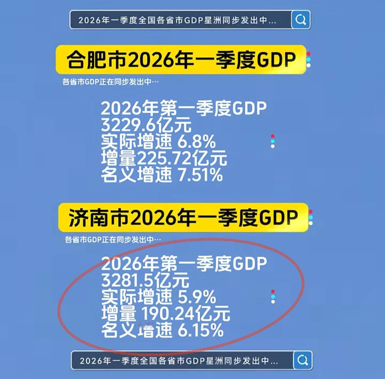 合肥追济南又成泡影?去年合肥已经都追到小数点后面了,今年第一季度居然差济南50多亿了。假如每个季度50亿,全年下来就200亿了,那就不是一年两年能追上的了。看来济南的底蕴还是深厚,合肥想追上,还需要汽车、家电、芯片之后的另一个爆发点才行。