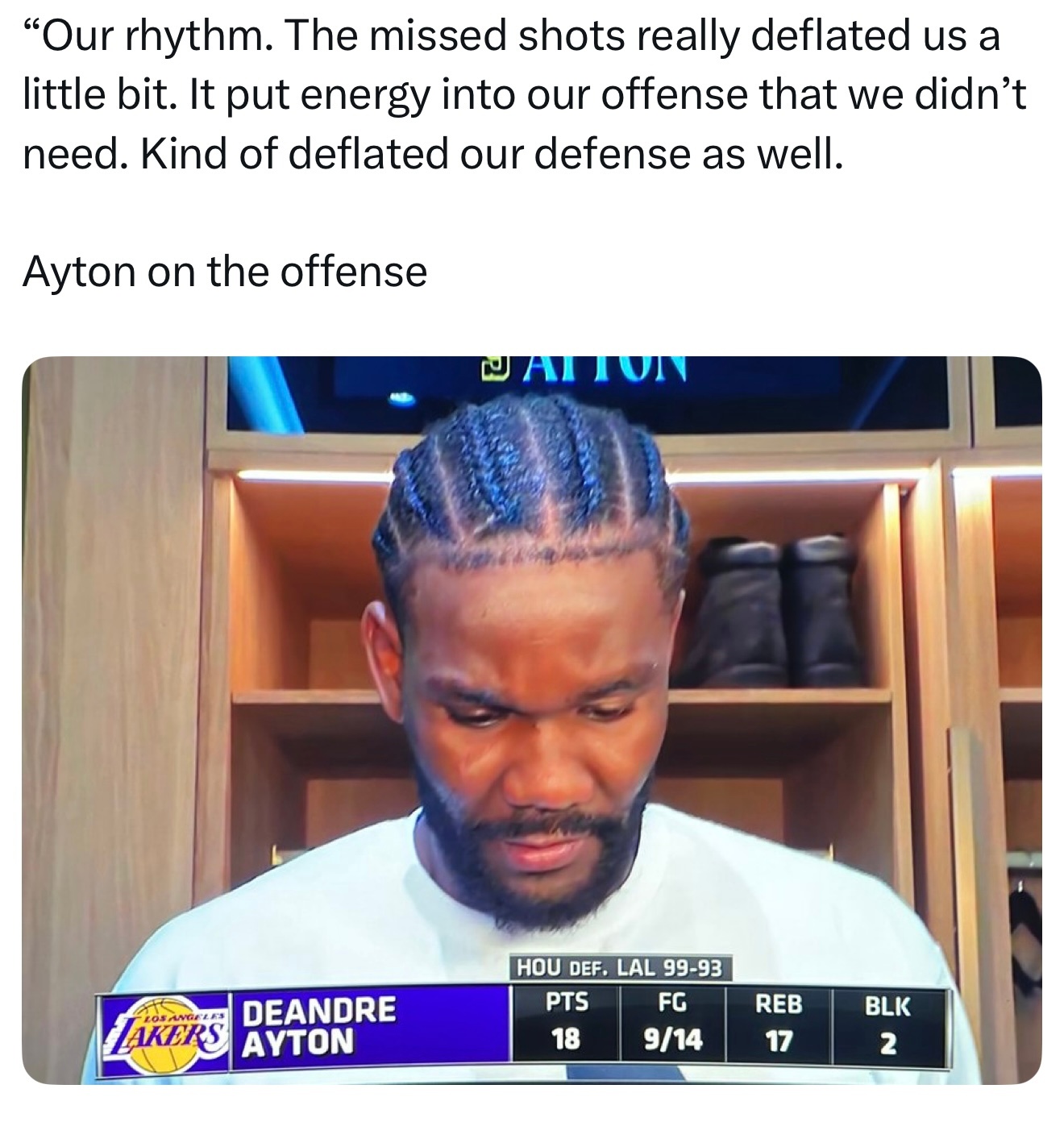 “我们的节奏。投丢的那些球真的让我们有点泄气。它给我们的进攻带来了不必要的负担,也在一定程度上拖累了我们的防守。”火箭2比3湖人