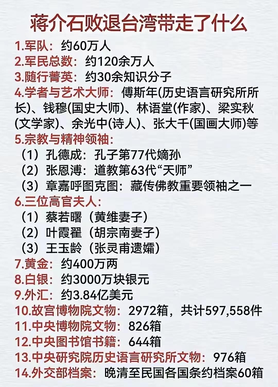 蒋介石败走台湾真是掏空了大陆的家底。 这话不假。1948年底至1949年,国民党政权崩溃前夕,蒋介石下令将大量黄金、白银、外汇和文物秘密运往台湾。 据史料记载,仅黄金一项,就有约400万两被分批运走,其中大部分是中央银行库存。1949年1月,蒋介石命其子蒋经国亲自押运,先后用军舰、货轮将黄金从上海运抵厦门,再转送台湾。 此外,还有数千万枚银元、数百万美元外汇,以及故宫博物院最珍贵的文物——包括毛公鼎、翠玉白菜、历代书画等,装了数千箱,全部打包带走。 更令人痛心的是,大量技术人才、工业设备也被强行迁台。上海等地工厂的机器被拆卸装箱,专业技术人员被裹挟离沪。据估计,当时大陆损失的黄金储备,若以购买力计算,足可支撑新中国初期数年经济建设。 两岸分离,从一开始就带着这样一笔沉重而心酸的“旧账”。