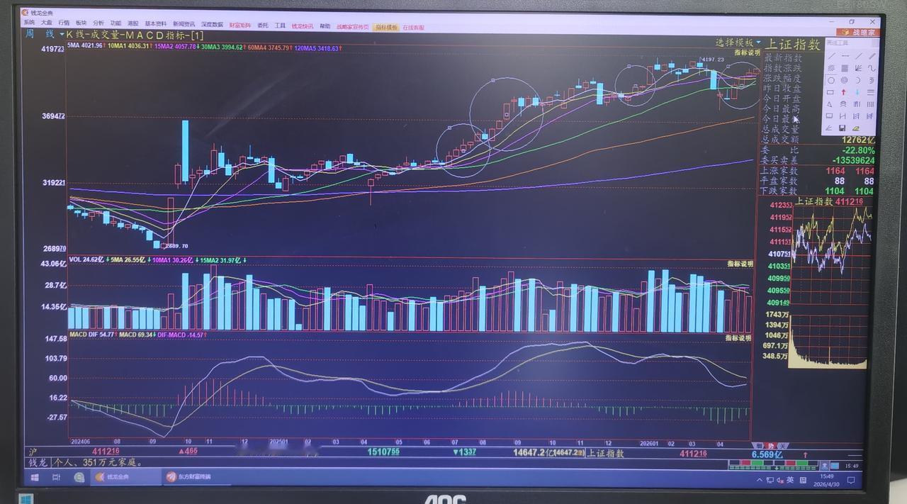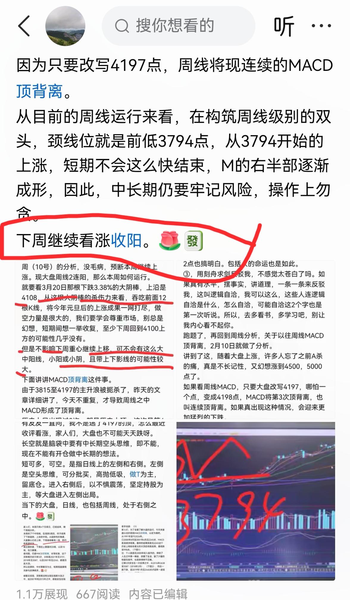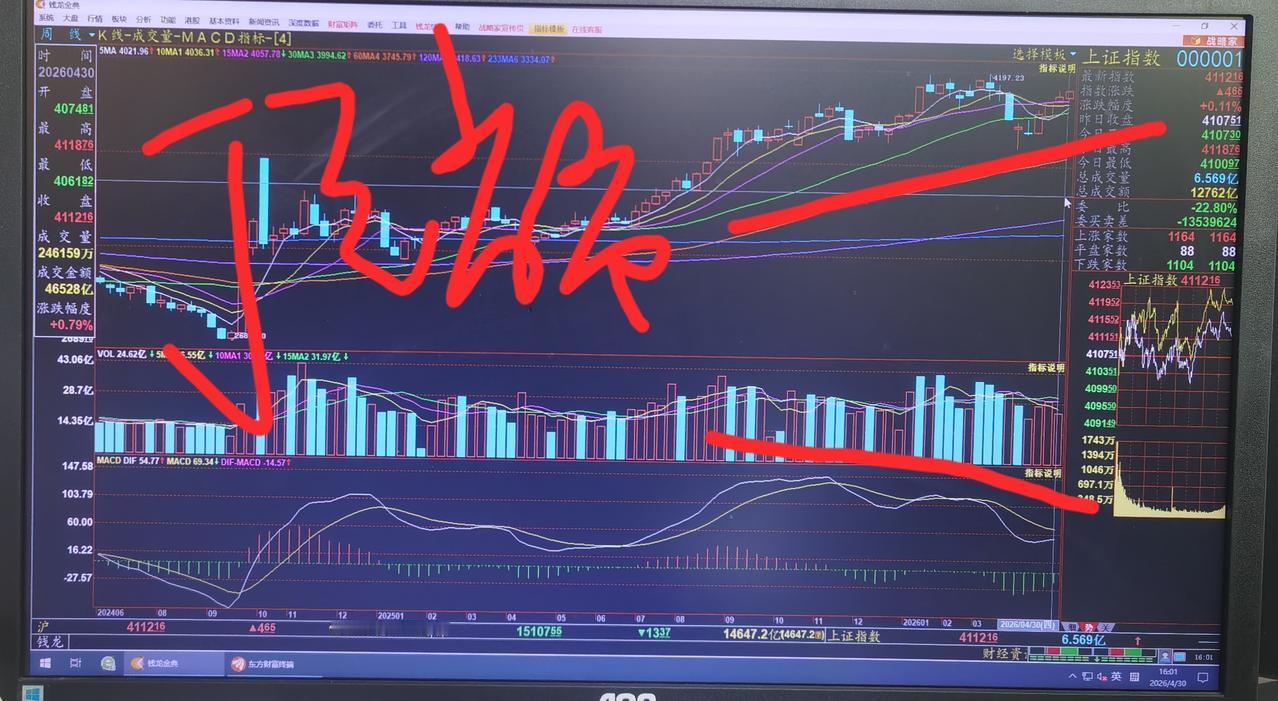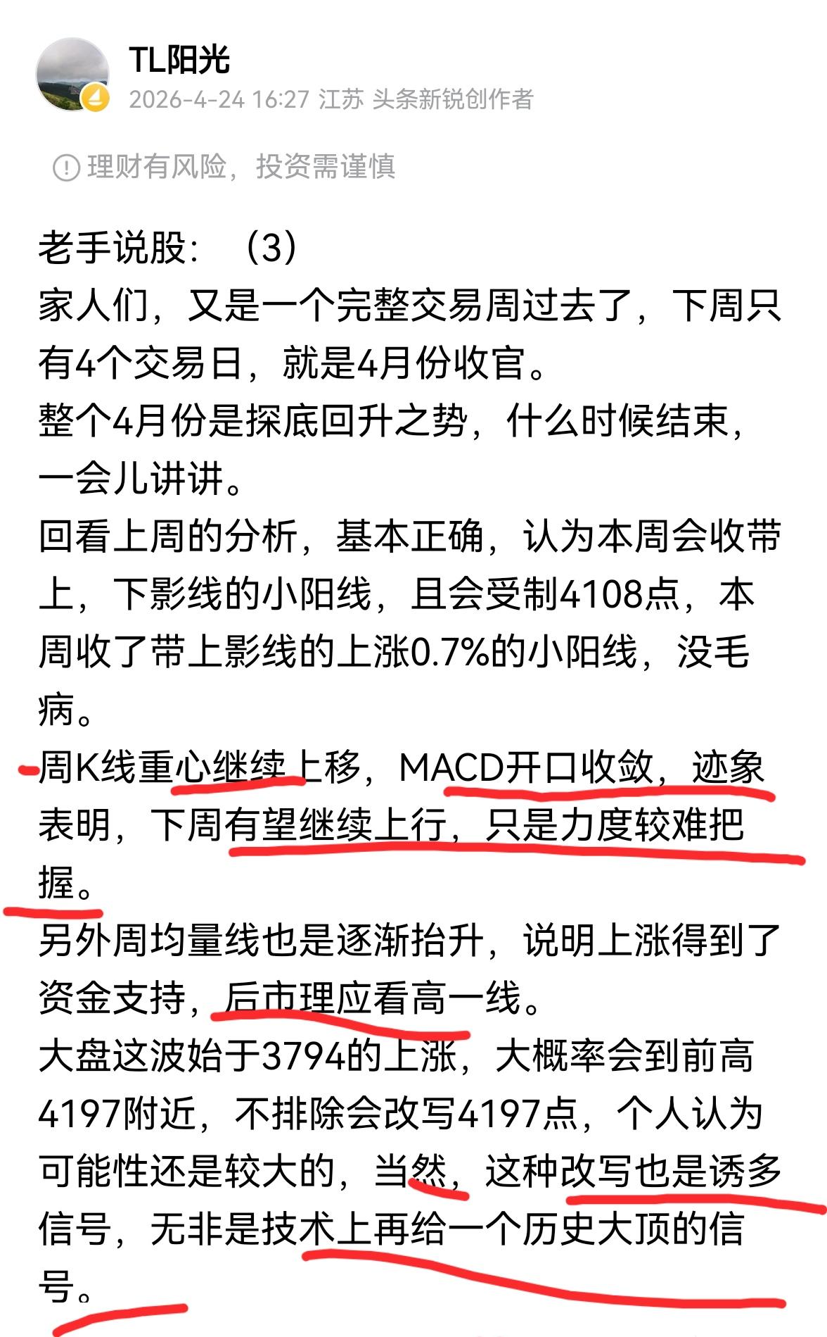 老手说股:(4) 家人们,4月份最后一个交易周结束,整个4月连涨4周,这是2024年924行情少见的,大盘运行至今,共有3次,分别是2025年6月见3347点,连涨5周。 2025年8月见3547点,连涨4周。 2025年12月见3815点,连涨4周。 连涨之后,下周会有冲高回落的风险,现在的大盘已经至4118,且这一段的走势与2025年12月份见3815,也是连涨4周见阶段性高点4190非常相似,短期涨幅较大,又在前高4190和4197附近,因此,节后冲高回落收阴的可能性较大。 回看上周的周收评,看涨本周,回看基本正确。下周上面已经给出了观点,收阴。 假设节后大盘改写4197创出新高,那么MACD出现连续顶背离,后市一旦展开调整,其惨烈度比4197至3794更甚,所以操作上一定要见好就收,注意防范未来长时间调整的风险。[玫瑰][烟花]