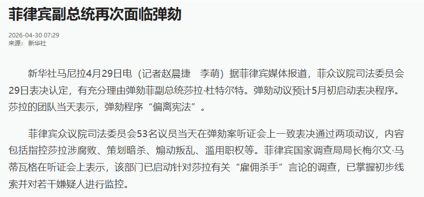 菲律宾政坛大地震,4月29日,众议院司法委员会53名议员全票表决,认定对副总统莎拉·杜特尔特的弹劾具备充分法律依据。 这位前总统杜特尔特之女、菲律宾政坛以强硬著称的“铁娘子”,不仅面临即刻下台、终身禁任公职的重罚,其筹备多年的2028总统大选之路,也已基本宣告终结。 关于这件事,菲律宾众议院司法委员会开了四次听证会,审查了对莎拉的一系列指控,包括滥用超过6亿披索的机密资金、拥有来源不明的巨额财富(涉及数十亿披索的可疑银行交易),还有最要命的一条——威胁刺杀总统。 对,你没听错,就是威胁要杀总统。莎拉在2024年公开说过,如果自己遭遇不测,她已经安排了专门的“杀手”,要对菲律宾现任总统费迪南德·马科斯及其夫人进行报复。这话一说出来,那可就是捅了马蜂窝了。 菲律宾国家调查局已经启动调查,局长梅尔文·马蒂瓦格在听证会上说,他们已经掌握了初步线索,并对若干嫌疑人进行监控,其中部分人是菲律宾武装部队成员。这种话放在哪个国家都是重罪,更何况是副总统对总统说的。 司法委员会的听证会上,莎拉连续四次缺席,她的律师团队说,只有在参议院审判启动时,她才会回应这些指控。可委员会没等她,53名议员一致表决,认定存在弹劾的“充分依据”。 为什么是全票?因为现在菲律宾众议院里,亲马科斯阵营的议员占绝对多数。政治这东西,从来都是实力说话。莎拉的父亲老杜特尔特当年和马科斯是政治盟友,两人联手赢得了2022年大选,马科斯当总统,莎拉当副总统。 可这政治联盟没维持多久,两大家族就因为权力分配、政策路线闹翻了,成了死对头。现在马科斯掌控着众议院,要收拾莎拉,那还不是易如反掌? 司法委员会通过只是第一步,接下来5月初众议院全体会议要投票。众议院有318名议员,只要拿到106张赞成票,也就是三分之一,弹劾案就能送到参议院。 参议院那边要是审理后定罪,莎拉就得立刻下台,而且终身不能再担任任何公职。这对莎拉来说意味着什么?意味着她的政治生涯可能就此终结,更别说她一直惦记着的2028年总统大位了。 莎拉这边也不是完全没动静。她的团队当天就发表声明,说弹劾程序“偏离宪法”,委员会的做法超出了宪法设定的框架。可这话在政治现实面前显得有点苍白。菲律宾历史上还没有副总统被弹劾罢免的先例,莎拉可能会成为第一个。 其实仔细想想,莎拉这次被弹劾,表面上看是因为那些具体的指控——滥用资金、来历不明的财富、威胁刺杀总统。但深层次看,这是菲律宾两大家族政治斗争的必然结果。 马科斯家族和杜特尔特家族从盟友变成对手,权力蛋糕就那么大,你多吃一口,我就得少吃一口。莎拉作为杜特尔特家族的政治继承人,又是下届总统的热门人选,自然成了马科斯阵营的重点“关照”对象。 而且莎拉这个人,性格太刚,说话太冲。那个“雇佣杀手”的言论,不管是不是气话,都给了对手最好的把柄。在政治场上,有时候一句话就能毁掉整个政治生涯。莎拉这次算是深刻体会到了。 现在弹劾案已经上了快车道,5月4日众议院就要表决。以目前众议院的党派格局,拿到106张赞成票的可能性很大。一旦进入参议院审判,那变数就多了。参议院24名议员,需要三分之二多数,也就是16票才能定罪。参议院的党派构成和众议院不太一样,杜特尔特家族在那边还有些影响力。但无论如何,这场弹劾大战已经开打,莎拉的政治前途悬了。 说到底,政治就是这么残酷。昨天还是风光无限的副总统、总统热门人选,今天就可能被53张赞成票钉在弹劾的耻辱柱上。莎拉·杜特尔特的故事告诉我们,在政治这场游戏里,没有永远的朋友,也没有永远的敌人,只有永远的利益。而她现在,正为那句“雇佣杀手”的狠话,付出惨重的政治代价。