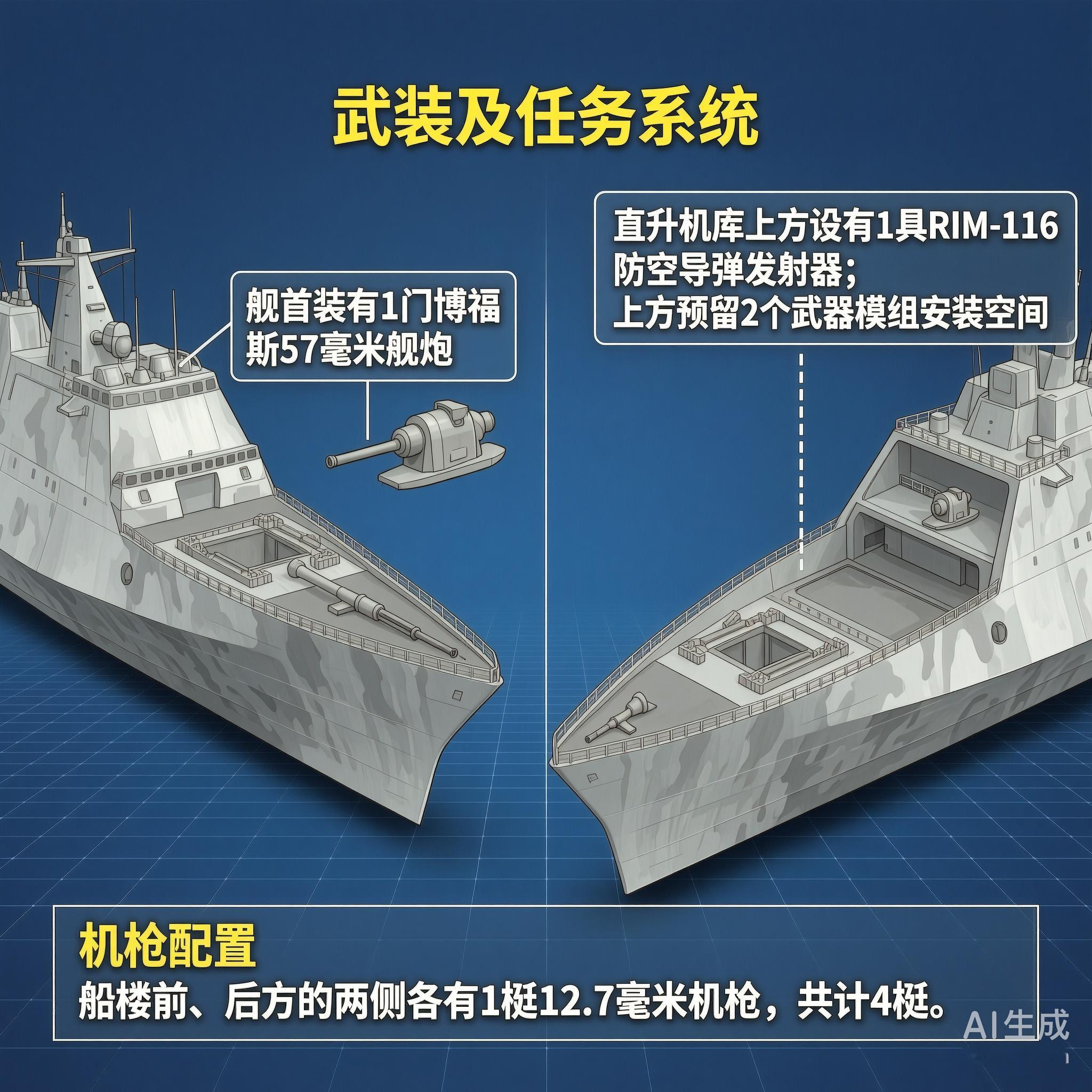 “自由”级可搭载220吨的武装及任务系统,舰首装有1门博福斯57毫米舰炮,直升机库上方设有1具RIM-116防空导弹发射器;船楼前、后方的两侧各有1挺12.7毫米机枪,共计4挺。直升机库上方预留2个武器模组安装空间,可依照任务需求设置垂直发射器来装填短程防空导弹,或者安装30毫米MK 46型机炮塔模组。