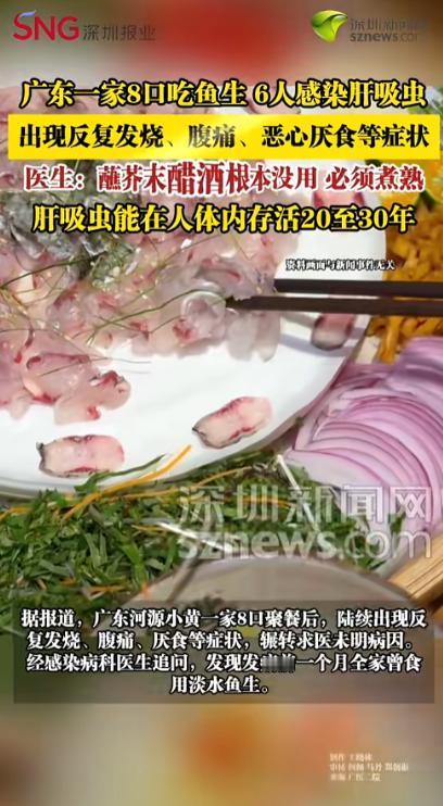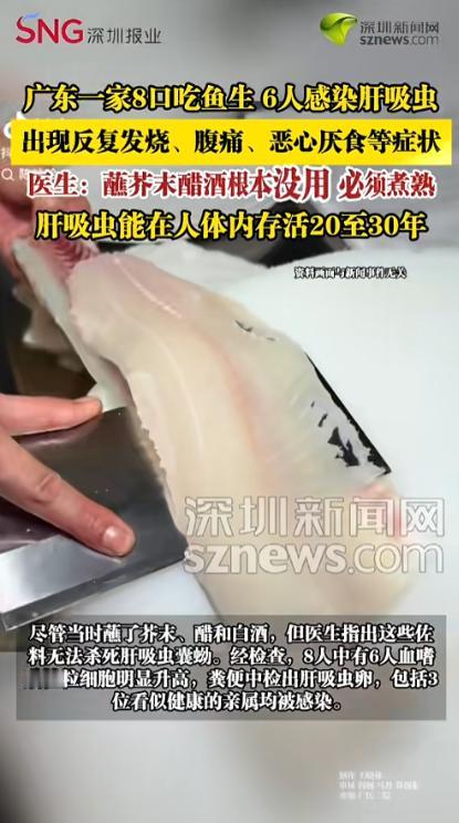 4 月 29 日报道,广东河源一家 8 口聚餐吃淡水鱼生,没想到吃出了大问题!先后有 6 人确诊感染肝吸虫,还反复发烧、腹痛厌食,折腾好久才找到病因。医生都说了,蘸芥末、泡白酒、倒醋这些土办法根本杀不死寄生虫,这虫在人体内能活二三十年,严重的还会诱发胆管癌。别拿自己的健康赌一口 “鲜甜”,这代价真的太大了! “早知道吃鱼生会闹出这么大的事,我死也不会让家里人碰一口!”广东河源的小黄提起不久前的家庭聚餐,语气里满是懊悔和自责。 事情要从一个月前说起,小黄家难得凑齐8口人,长辈提议做一桌丰盛的家宴,其中最受期待的,就是新鲜现切的淡水鱼生。 家人特意从当地市场挑选了鲜活的淡水鱼,当场处理、现切现摆,薄嫩的鱼肉裹上翠绿的芥末,再淋上少许香醋,有人还会搭配一口高度白酒,大家都觉得这样既能尝到鱼肉的鲜甜,又能靠芥末、白酒杀菌,完全不用担心安全问题。 聚餐当天,一家人围坐在一起,你一筷子我一勺,说说笑笑间就把一盘鱼生吃了个精光,没人想过,这份口腹之欲的背后,藏着致命的隐患。 聚餐结束后的一周,小黄最先出现了异常,起初只是觉得浑身发冷、头晕乏力,紧接着就开始高烧不退,体温一度飙升到39度多,她以为只是普通感冒,吃了退烧药后,体温暂时降了下来,可没过多久又会反复升高。 更让她难受的是,腹部开始隐隐作痛,尤其是右上腹,按压时疼痛会加重,还伴随着严重的厌食,不管是平时爱吃的饭菜,还是清淡的粥品,都一口咽不下去,短短几天就瘦了好几斤。 小黄的妈妈看到女儿难受,连忙带她去附近的医院检查,抽血、做彩超,一系列检查下来,却没查出任何异常,医生只能按照普通感冒和肠胃炎来治疗,开了消炎、退烧的药,可小黄的症状丝毫没有好转,依旧反复发烧、腹痛不止。 就在小黄治病的同时,她的妈妈也开始出现类似的症状,恶心反胃、浑身乏力,连续二十多天没怎么吃东西,体重明显下降,整个人看起来无精打采。 紧接着小黄的舅舅也没能幸免,被反复的腹痛折磨得睡不着觉,吃了不少肠胃药,却一点效果都没有。 短短半个月,家里3个人接连病倒,症状一模一样,辗转了多家医院,做遍了各项检查,始终找不到病因,一家人被焦虑和恐慌笼罩着,不知道到底是哪里出了问题。 直到他们前往广州医科大学附属第二医院就诊,感染病科的医生仔细询问了他们的症状和近期饮食,当听到“一个月前吃过大淡水鱼生”时,医生立刻提高了警惕,追问他们吃鱼生时是否做过杀菌处理,小黄的妈妈还辩解道:“我们都蘸了芥末、醋,还喝了白酒,以为能杀死虫子,没想到还是出了事。” 医生当即建议,当天一起吃鱼生的8口人全部来医院做检查,检查结果让全家人都惊呆了:8人中有6人确诊感染了肝吸虫,其中3人虽然没有明显症状,但血液里的嗜酸性粒细胞已经明显升高,这是寄生虫感染的典型信号,粪便中也都检出了肝吸虫卵。 医生解释肝吸虫的囊蚴常藏在草鱼、鲩鱼等淡水鱼体内,芥末、醋、白酒短时间内根本无法将其杀死,只有将鱼肉彻底煮熟,中心温度达到70℃以上并持续5分钟,才能真正杜绝风险。 更让人后怕的是,肝吸虫进入人体后,大约一个月就能发育成成虫,并且能在人体内存活二三十年,持续损伤胆管壁,引发胆管炎、胆结石,长期感染还会大幅增加胆管癌的风险。 好在小黄一家发现及时,经过规范的驱虫治疗,目前身体正在逐步恢复,但这段时间的病痛折磨,让他们彻底打消了吃淡水鱼生的念头。 这起事件曝光后,网友们纷纷留言警醒,有人说:“以前总觉得蘸芥末、喝白酒就能杀虫,看完这个才知道,都是自欺欺人!” 还有网友分享自己的经历:“我朋友之前也爱吃淡水鱼生,后来查出肝吸虫,治疗了大半年才好,太遭罪了。” 也有网友感慨:“一口鲜甜,可能要付出一辈子的健康代价,真的不值得。” 其实类似的案例并不是个例,新鲜的口感固然诱人,但健康永远是第一位的,所谓的“土办法”根本无法抵御寄生虫的侵袭,不要因为一时的贪鲜,拿自己和家人的健康去冒险。 愿这起事件能给所有人提个醒,摒弃生食淡水鱼虾的陋习,管住嘴、守好健康底线,才是对自己和家人最负责的做法。 看完这起事件,你有没有吃过淡水鱼生?对于生食淡水鱼虾的风险,你还有哪些看法?欢迎在评论区留言分享。 信息来源:《广东一家8口吃鱼生 6人感染肝吸虫,医生:蘸芥末醋酒根本没用 必须煮熟》深圳新闻网