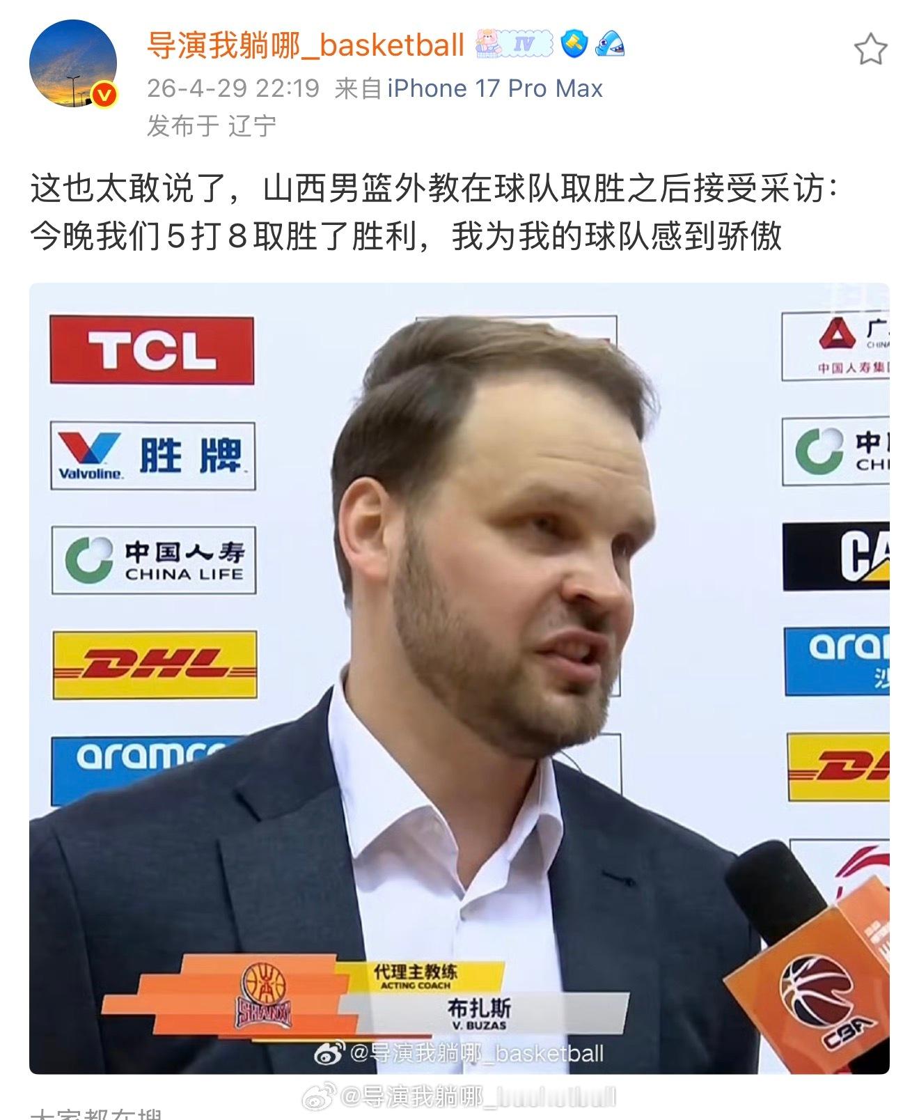 CBA官方开出罚单:因发表“5打8”的不合适言论,山西男篮助理教练被处罚3万元,给予山西男篮总经理罚款1万元
