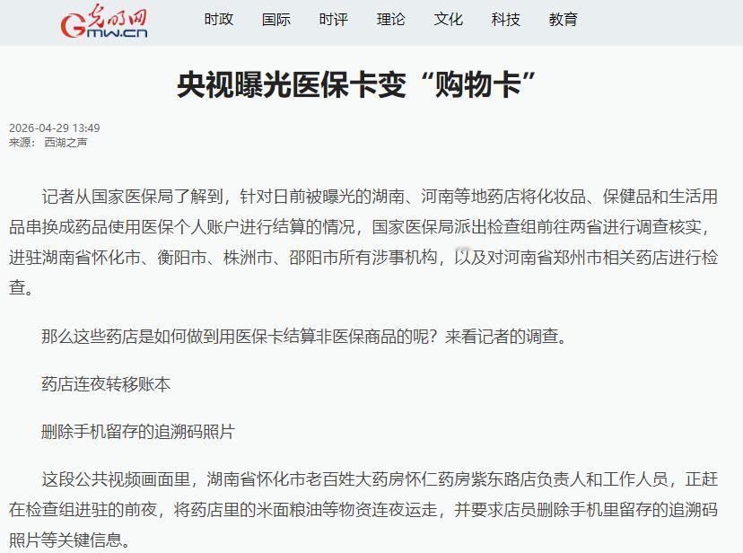 医保卡从来都不是“购物卡”!一场守护医保救命钱的雷霆行动已经全面打响,湖南河南两地上千家药店被集中突查,那些藏在药店里的违规猫腻,这次被彻底掀了个底朝天。 最近有媒体通过暗访曝光了湖南、河南多地连锁药店竟然把化妆品、保健品、米面粮油等生活用品,包装成医保可结算的药品,让老百姓手里的医保卡,变相成了可以随便消费的“购物卡”,堂而皇之地套取医保个人账户里的资金。 消息一经曝光,立刻引发了全社会的广泛关注,也牵动了无数参保人的心,毕竟医保卡里的每一分钱,都是老百姓的看病钱、救命钱,容不得任何人随意挪用和套取。 事件曝光的第一时间,国家医保局就迅速做出反应,立刻派出专项检查组,奔赴湖南、河南两省,对所有涉事机构开展全面的调查核实工作。 可让人没想到的是,面对即将到来的检查,部分涉事药店非但没有主动整改、配合调查,反而想着连夜销毁证据、掩盖违规行为。 但这些欲盖弥彰的操作,终究还是瞒不过检查组的眼睛。进驻现场后,检查组工作人员很快就从柜台抽屉里遗留的几页手写销售记录里,找到了违规操作的关键证据。 更让人震惊的是,这样的违规操作,涉事药店几乎每天都在做,早已形成了一套成熟的违规流程。 检查组经过深入调查,彻底摸清了这些药店串换药品、套取医保基金的隐蔽套路。 原来这些药店早就把药品的销售和扫码环节拆分开,平日里遇到顾客用现金买药,或者在外卖平台上卖药的时候,因为不涉及医保结算,店员就只把药卖给顾客,却不扫码核销药品的追溯码,反而偷偷把药盒上的追溯码拍下来,存在手机里攒起来。 等到有顾客想用医保卡买化妆品、日用品等非医保商品时,店员就不用拿出任何药品,只需要拿出之前存好的追溯码照片扫码上传,就能把非医保商品的消费,伪装成合规的医保药品结算,轻轻松松就完成了套取医保资金的操作。 用这种偷梁换柱的方式,药店既能把账目做平,避开医保系统的大数据监管,还能靠这种违规操作拉高门店销售额,可损害的,却是国家医保基金的安全,和每一位参保人的切身利益。 这种看似“占便宜”的操作,实则是在配合药店完成骗保行为,不仅会助长医保基金的流失,最终还会影响到我们自己的医保使用权益,甚至可能要承担相应的法律责任。 而对于定点药店来说,医保定点资格从来都不是可以随意挥霍的“金字招牌”,只有守住合规经营的底线,才能真正赢得老百姓的信任,任何试图钻监管空子、损害参保人利益的行为,最终都只会搬起石头砸自己的脚。