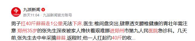 2026 年 4 月 28 日报道,郑州 35 岁壮汉扛 40 斤蒜苔走 1 公里,直接被送进医院,疼得连床都下不了,最后确诊腰椎间盘突出。平时看着身强力壮,没想到一次普通的农活就把腰干废了。别以为年轻就是本钱,腰椎根本经不起你这么瞎造,真疼起来才知道,这身体透支的账,没一个人能赖掉! “我以为自己年轻力壮,扛这点东西根本不算事,哪想到会直接瘫在床上。”躺在医院急诊病床上的张先生,说起事发当晚的经历,语气里全是懊恼。 今年35岁的他,在旁人眼里一直是那种身强力壮、能扛能打的汉子,平时搬重物、干体力活从不含糊,谁也没料到,一次看似平常的田间劳作,竟成了压垮他的最后一根稻草。 事情的起因,是张先生老家的蒜苔到了采收季,4月27日傍晚,他想着帮家里搭把手,便跟着家人去田里收蒜苔。 收完之后看着地上捆好的几捆蒜苔,他想着离存放点也就一公里路,没必要再叫车,便主动扛起了一捆大约40斤重的蒜苔,想着自己走过去也很快。 刚开始走的时候,他只觉得肩上有点沉,也没当回事,还跟旁边的家人说笑,说这点重量对他来说根本不算什么。 可越往前走,他越觉得不对劲,腰上的力气像是被一点点抽走,每走一步,腰上都传来一阵酸胀感,可他还是硬撑着走完了这一公里路。 到家之后,张先生只觉得腰上有点累,想着躺一会儿就能缓过来,便直接躺到了床上,可这一躺,他就再也没能轻松地起来。 没过多久,剧烈的腰痛就席卷了他,那种疼不是普通的肌肉酸痛,而是从腰眼一直窜到腿上的刺痛,连翻身、挪动一下都像是在受刑。 他试着想坐起来,可刚一用力,腰上就传来一阵钻心的疼,整个人直接软了回去。家人见状也慌了神,赶紧连夜把他搀扶着送到了郑州市第九人民医院的急诊科。 在医院里,张先生扶着腰,连走路都只能一步一步地挪,每动一下都疼得他直冒冷汗。 医生给他做了详细的检查,结果很快出来了:腰4-5、腰5-骶1椎间盘突出,还伴有腰椎退变。 医生拿着检查报告,反复叮嘱他,这次的急性腰突,和他扛重物时不当的发力方式有很大关系,青壮年看似强壮的腰椎,其实根本经不起这种突然的、高强度的负重冲击,很多人就是仗着自己年轻,忽视了腰部的保护,才让小毛病变成了大问题。 张先生躺在病床上,看着自己连下床都需要家人帮忙,心里又悔又怕,他怎么也想不通,自己扛过比这重得多的东西,这次怎么偏偏栽在了一捆蒜苔上。 这件事被报道之后,很快就在网上引发了热议,不少网友都在评论区分享了自己的经历。 有网友说,自己也是三十多岁的时候,搬了一次重物,直接就腰突了,现在稍微累一点就疼得直不起腰,再也不敢逞强了。 还有网友留言,说自己身边好多朋友,平时不注意护腰,久坐、搬重物啥都不注意,现在年纪轻轻就开始贴膏药、做理疗,比爸妈的腰还差。 也有网友感慨,现在的年轻人,总觉得自己身体好,熬个夜、扛个重物都不当回事,可身体从来不会骗人,那些你欠下的“健康债”,总有一天会找上门来。 其实张先生的遭遇并不是个例,生活里像他这样仗着年轻透支身体的人还有很多,大家总觉得,腰突是中老年人的专利,可现在越来越多的年轻人,因为久坐、不良姿势、突然负重,早早地就被腰椎问题缠上了。 我们总以为自己年轻,身体就是铁打的,可腰椎里的椎间盘,其实就像一个个小小的“软垫”,它能承受的压力是有限的,突然的负重、不当的发力,都会让它瞬间受损。 就像这次张先生扛蒜苔,看似只是40斤的重量,可走路时身体的晃动、发力时腰部的扭曲,都会让腰椎承受几倍甚至十几倍的压力,一次逞强,就可能让它彻底“罢工”。 这件事也给我们所有人提了个醒,别再仗着年轻就肆意透支自己的身体了,那些看似不起眼的小伤小痛,从来都不是凭空出现的,都是身体在给我们发出信号。 护腰从来都不是中老年人的事,年轻人更要注意,搬重物的时候别硬扛,先蹲下再起身,别直接弯腰去搬;平时少久坐,多起来活动活动,别让腰椎一直保持一个姿势。 毕竟健康从来都不是我们可以肆意挥霍的本钱,你今天对身体的每一次忽视,都可能变成明天的一场意外。 不知道你有没有过类似的逞强经历?有没有被腰上的小毛病困扰过?欢迎在评论区聊聊你的看法。