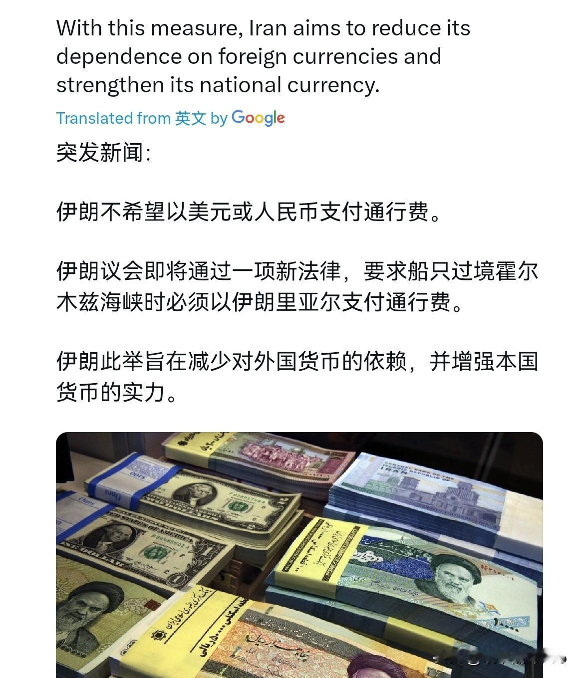 伊朗这一招真狠!不收美元,不收人民币,现在要改收伊朗的里亚尔了!4月30日,根据外媒报道,外媒称,伊朗不会以美元或人民币缴纳通行费。伊朗议会即将通过一项新法案,要求途经霍尔木兹海峡的船只必须以伊朗里亚尔缴纳通行费。伊朗此举旨在降低对外币的依赖,同时提振本国货币地位。 不得不说,伊朗的这一招是真狠。为什么这样说呢?从伊朗的角度而言,不收美元,也不收人民币,这意味着所有通行国家的船只都必须想方设法取得伊朗货币。那么所有航运企业、能源公司想要正常通行霍尔木兹海峡,就必须开设里亚尔结算账户、储备里亚尔外汇,无形中会大幅增加里亚尔的国际流通需求与交易量。 美国刚刚通过制裁令,打击伊朗的“影子银行”,试图从金融层面彻底锁死伊朗的跨境资金流转,切断其绕过美元体系的结算通道。可伊朗反手祭出霍尔木兹海峡通行费本币结算这一招,恰好精准的对冲了美国的金融制裁。伊朗强制霍尔木兹海峡船只只用里亚尔缴费,等于凭空为里亚尔创造了刚性国际需求。无疑,面对美国的金融封锁,伊朗的回应是有声有色。