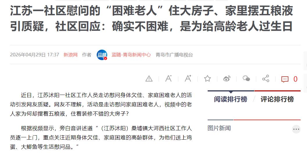 基层送温暖宣传又翻车!江苏沭阳社区慰问视频刚爆,全网直接炸锅,网友更怒:敬老本是好事,为啥硬蹭困难帮扶流量?公共资源岂能这么玩?真正的困难老人到底在哪? 最近江苏沭阳这段社区慰问的视频,直接把全网网友看懵了——嘴上说着慰问“身体欠佳、家庭困难的高龄老人”,结果镜头扫到老人家里,好家伙,精致的精装大房子、酒柜上明晃晃摆着五粮液,院子里还有专门打理的景观鱼池,这条件,别说和“困难”两个字不沾边,怕是比绝大多数天天起早贪黑加班的打工人过得都滋润。 视频传开之后,网友的质疑声瞬间铺天盖地。大家纷纷追问:这就是你们说的困难老人?如果住着精装房、喝得起五粮液都算困难,那我们这些普通人算什么?真正吃不上饭、看不起病的孤寡老人,你们到底有没有去慰问? 面对全网的质疑,4月29日,涉事社区的工作人员和当地民政部门先后给出了回应。 社区工作人员解释说,这次活动根本不是慰问困难户,而是给辖区里80岁以上的老人过生日的敬老活动,只要年满80岁,不管家庭条件好不好,都会上门送祝福,只是因为有些老人不爱吃蛋糕,才改成了送鸡蛋、鲫鱼这些东西,还说活动的“出发点是好的”,后续会在走访形式和宣传上多加注意。 而沭阳县民政局的工作人员则直言,按照困难老人慰问的标准,住着大房子、摆着五粮液的家庭,绝对不可能成为困难帮扶对象,这件事确实太夸张了,是乡镇和社区层面的工作问题。 本以为官方回应能平息争议,可没想到这番解释一出,网友们更不买账了。网友们生气的点,从来都不是社区给80岁老人送生日祝福。谁家没有老人?给高龄老人祝寿,这本来是天大的好事,别说送鸡蛋鲫鱼,就算是自掏腰包给老人送蛋糕、送红包,网友们都得竖大拇指夸一句社区有心了。 可问题的关键就在于,你明明做的是不分贫富、全员覆盖的敬老祝寿活动,为什么非要在视频里硬贴上“困难老人”、“帮扶弱势群体”的标签?这不是拿着敬老的好事,去蹭困难帮扶的正能量流量吗? 在普通人的认知里,能被纳入“困难帮扶”的老人,应该是什么样的?是无儿无女、无人照料的孤寡老人,是没有收入来源、连日常吃药都犯难的老人,是住着老旧房子、冬天舍不得开暖气、过年舍不得买一瓶好酒的老人。 这些人才是真正需要帮扶、需要送温暖的群体,他们中的很多人,可能一辈子都没喝过五粮液,甚至连像样的装修都没见过。 帮扶资金和物资,到底该用在谁身上?如果是社区自有经费,给所有80岁老人一视同仁送祝福,没人有半句怨言;可如果是打着困难帮扶的旗号,用着专项帮扶的公共资源,去做普惠性的祝寿活动,那就是对帮扶资源的浪费,更是对真正困难群体的不负责。 就在4月30日,当地也发布了最新的调查通报,明确视频里的老人今年81岁,这次上门是因为老人刚住院康复,恰逢生日开展的关爱活动,并非民政保障的困难帮扶对象。 可就算是这样,也依然绕不开最根本的问题:既然不是困难帮扶,为什么视频里要明确标注“家庭困难的高龄群体”?说到底,还是基层工作的不严谨,是把本该踏踏实实做的民生工作,当成了拍视频、搞宣传的面子工程。 咱们常说,老吾老以及人之老,敬老爱老从来都是值得称赞的好事,精准帮扶困难群体更是老百姓拍手叫好的实事。 可好事要办好,实事要办实,不能光想着拍个好看的视频、写个漂亮的宣传稿就万事大吉。 老百姓的眼睛是雪亮的,你是不是真的走到了群众里,是不是真的把温暖送到了真正需要的人手里,大家一眼就能看明白。