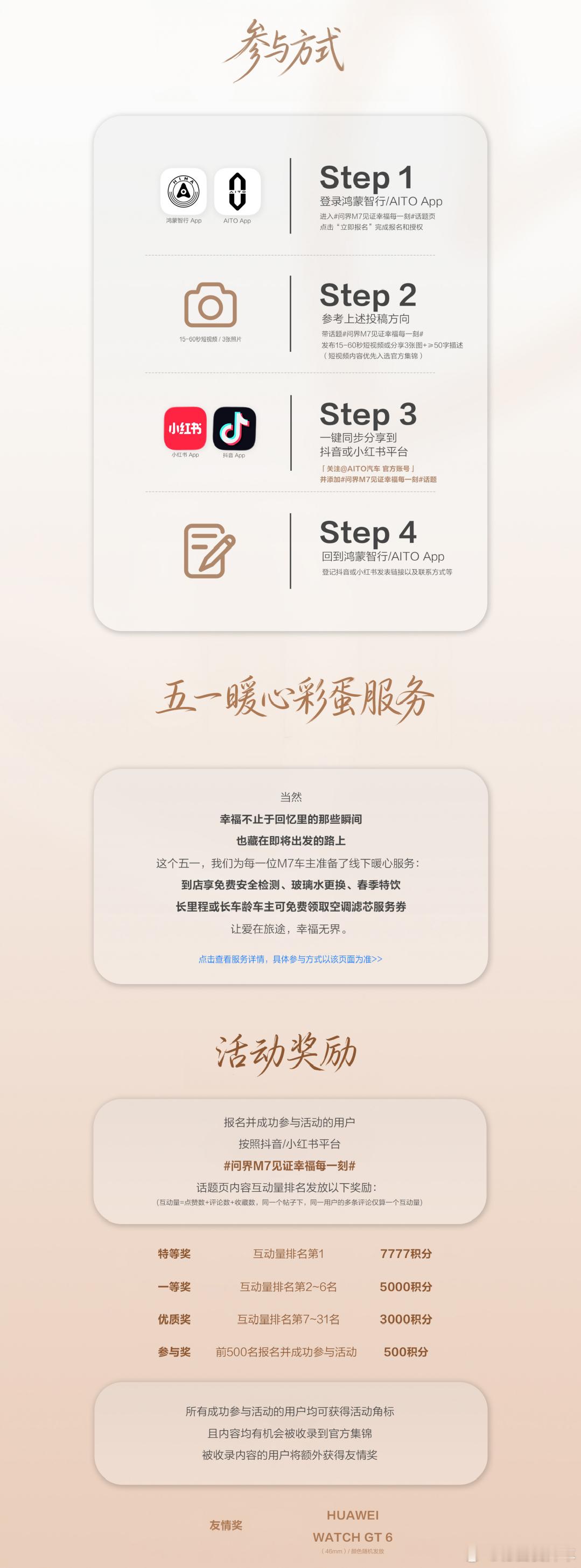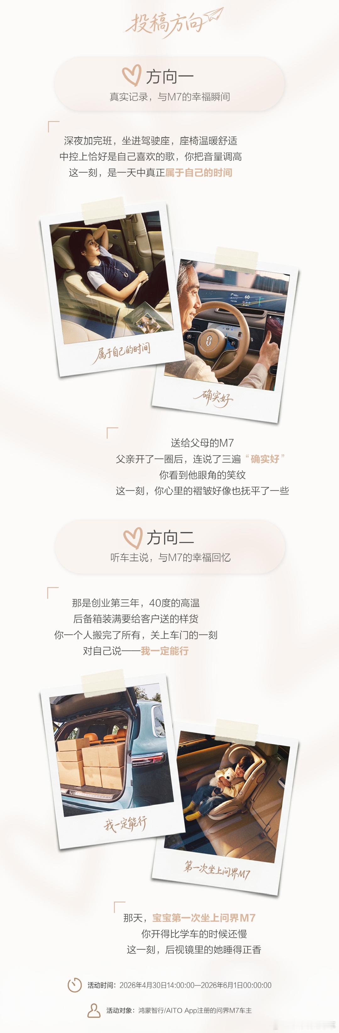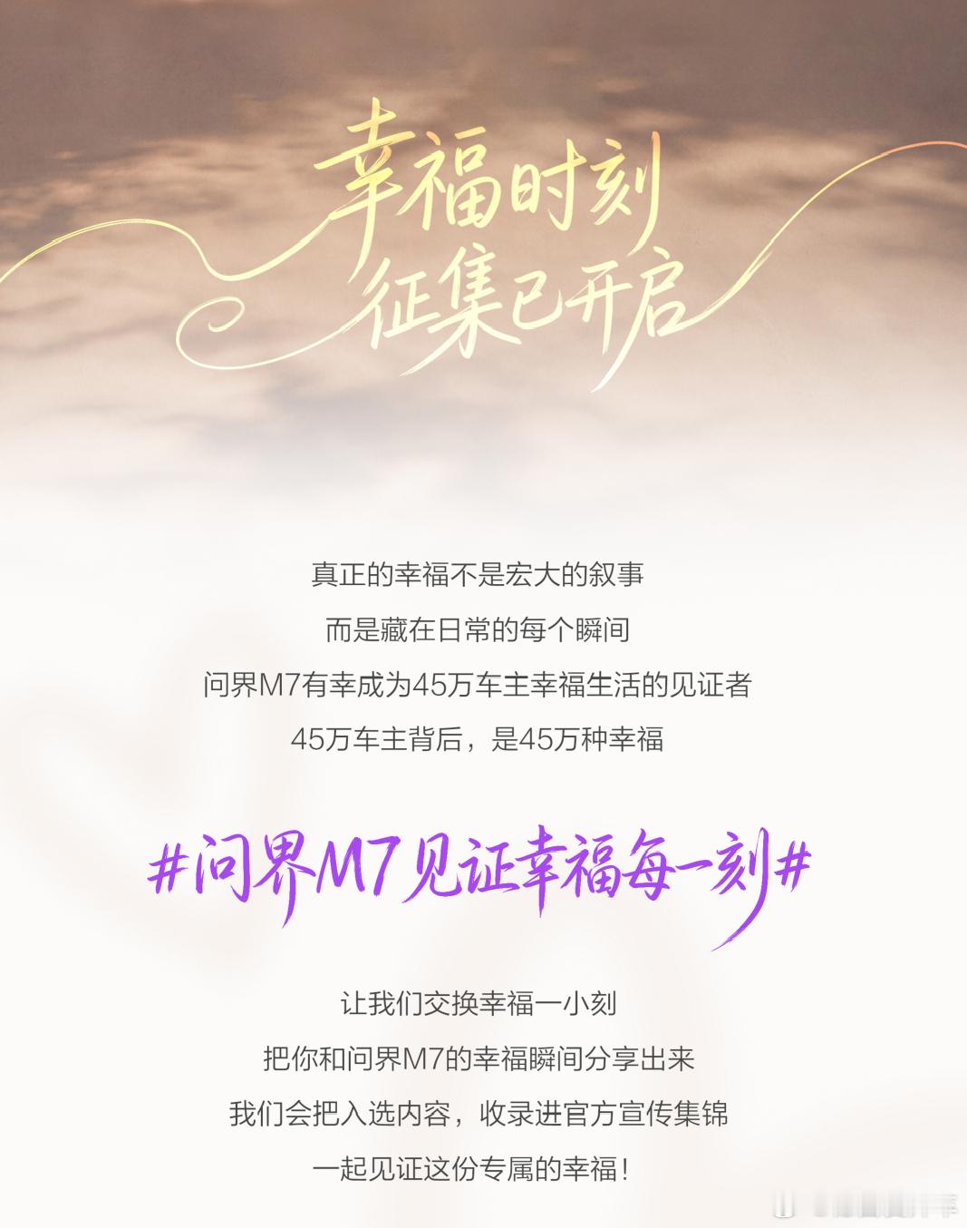 今日,官方正式启动「问界M7见证幸福每一刻」征集活动,鼓励车主分享与爱车相伴的幸福时刻。