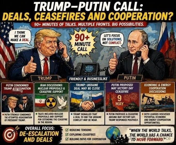 特朗普和普京本次通电话,时长大约一个半小时,按照俄罗斯总统助理乌沙科夫的话说,重点是普京愿意在“胜利日”期间再次进行临时停火,而特朗普对此表示支持;