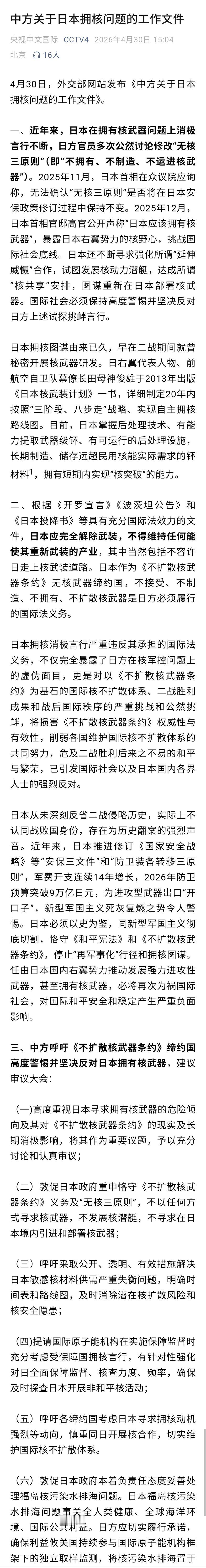 太好了,我国终于对日本发展核武器采取实质动作! 今天,我国发布了《中方关于日本拥核问题的工作文件》,这是一份正式的文件,比以前只是动嘴强了很多,可以看作一个实质动作了。 文件里的内容,涉及好几个方面内容,动作上,准备先在国际原子能机构向日本施压。 可能有人会觉得我国还是有点软,不过我觉得做事要一步一步来,现在先有文件,说出来,下一步才好开展进一步的实质动作,相信我国做事不会没后后手。 不得不说,我国真的需要认真对待日本拥核问题了,日本这些年一直贼心不死,从来没有认真反省过自己的罪恶,一旦日本真的拥有了核武器,后果不堪设想,我国不得不防。 不管从哪个层面,我国限制日本发展核武器都合情合理,美国能因为发展核武器制裁伊朗,那么我国管制战败国日本发展核武器更是合情合理了!