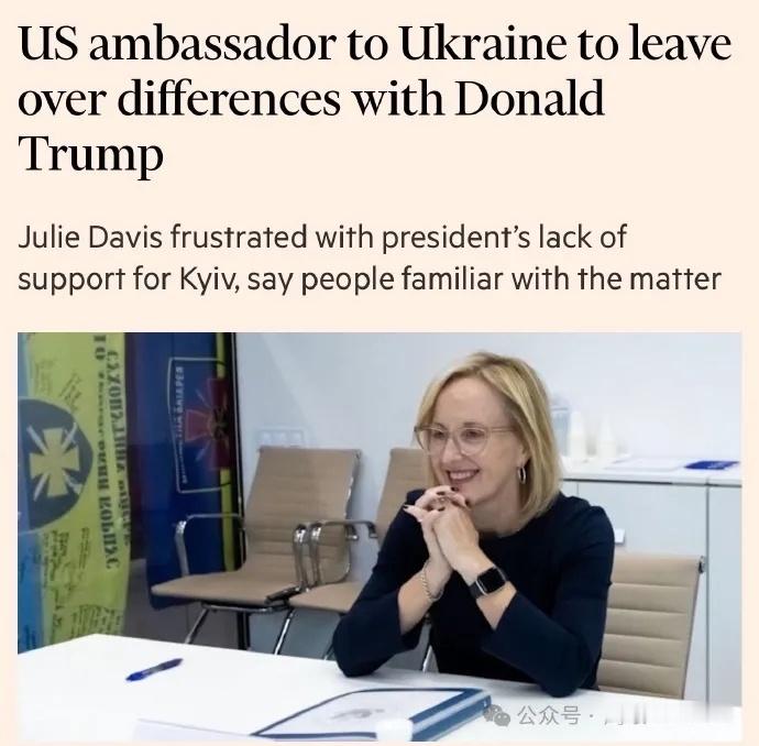 据《金融时报》报道,美国驻乌克兰大使,确切说是由特朗普任命而未经美国国会确认的美国驻乌克兰大使馆临时代办朱莉·戴维斯,也将辞职,原因是“对美国总统特朗普缺乏对乌克兰的支持感到不满而心生挫败感”;