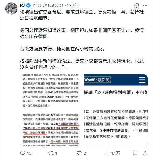 德国绝!捷克更绝! 外媒曝出赖清德想借道欧洲的事,看完我只能说:德国绝,捷克更绝! ➡️德国是压根不想沾这过街老鼠,怕惹一身麻烦折在自己手里; ➡️捷克就更有意思了,完全装死。别忘了捷克前议长当初还动不动窜访台湾刷存在感。 经这事儿一看,两国做法完全贴合大众刻板印象: ➡️德国做事一板一眼、务实避坑; ➡️捷克则是骨子里精明圆滑,狡猾得很! 赖清德这次 “借道” 被全线封堵,彻底沦为国际笑话,再次证明:分裂国家,死路一条! Source: X