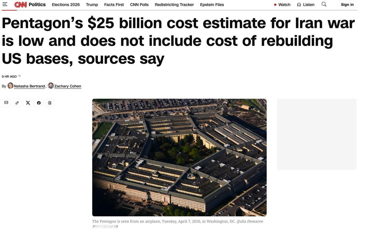 五角大楼官方称对伊作战已花费250亿美元。但CNN援引三名知情人士报道,这一数字被严重压低——并未包括修复美军基地和替换被毁资产的费用。 消息人士透露,真实成本“更接近400至500亿美元”。 CNN回顾指出,冲突爆发后48小时内,伊朗报复性打击已击中至少9个美军设施,分布在巴林、科威特、伊拉克、阿联酋和卡塔尔。仅一部受损雷达的损失就高达数亿美元。