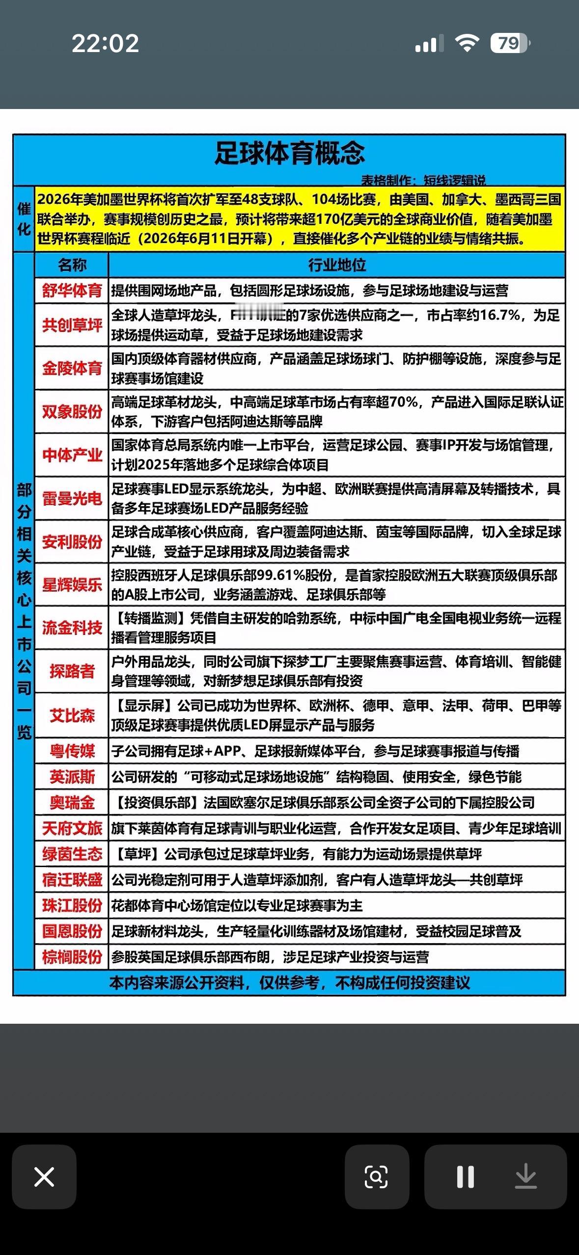 足球产业概念股全解析,一图看懂! 足球产业概念股一直是投资领域的热门话题。像莱茵体育,它积极布局足球赛事运营等业务,在足球产业概念里算是比较受关注的。还有雷曼光电,为足球赛事提供LED显示设备,和足球产业紧密相连。 这些概念股背后反映的是足球产业巨大的商业潜力。比如一场大型足球赛事,涉及门票、转播权、周边产品等多个盈利点。一图看懂足球产业概念股,能让投资者快速掌握各股票的关键信息,在复杂的股市中快速找到投资方向,说不定还能抓住足球产业发展带来的红利呢。