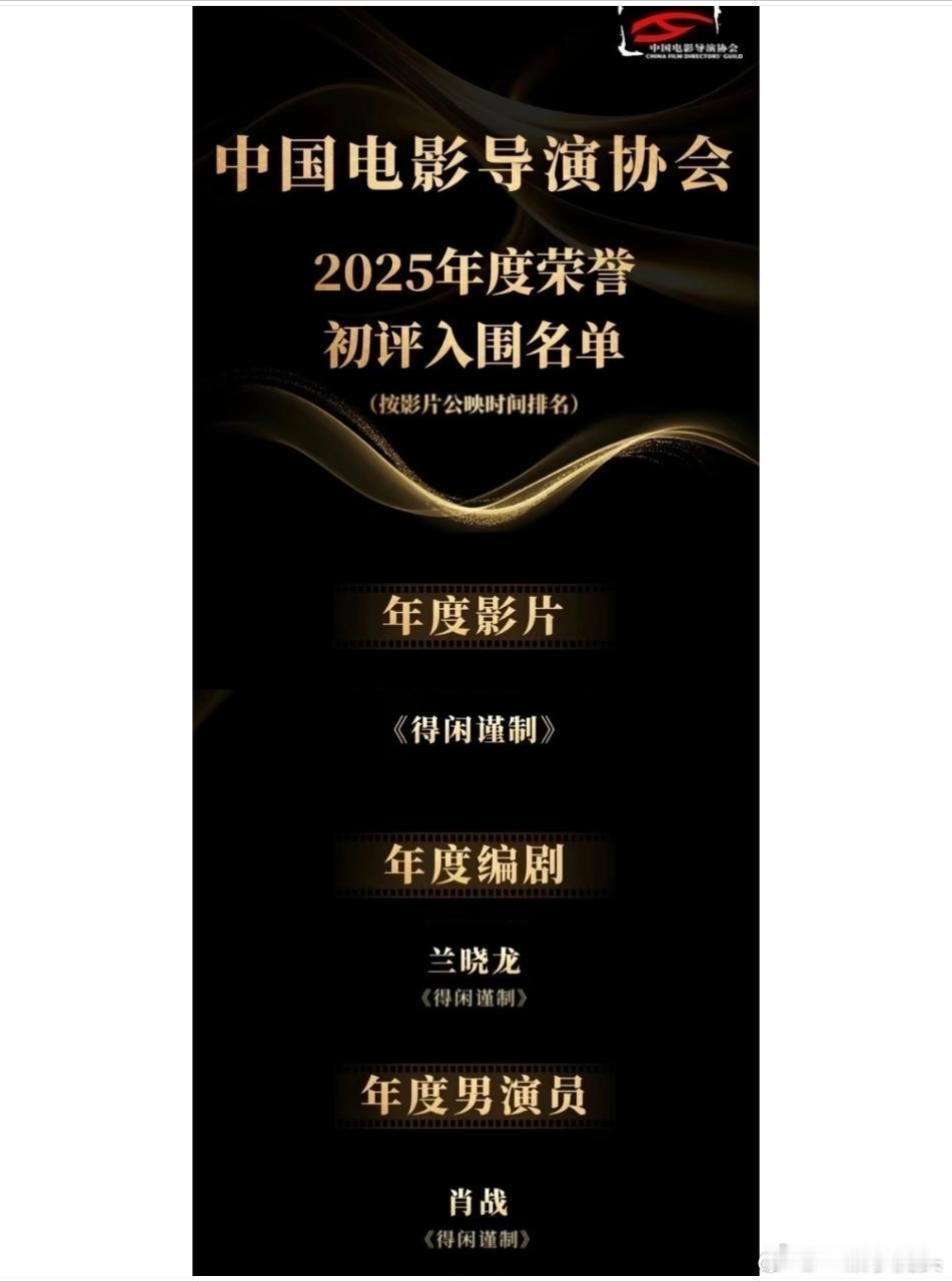 中国电影导演协会2025年度荣誉初评入围名单揭晓,🎉恭喜肖战入围年度男演员,得闲谨制入围年度影片, 编剧兰晓龙入围年度编剧!