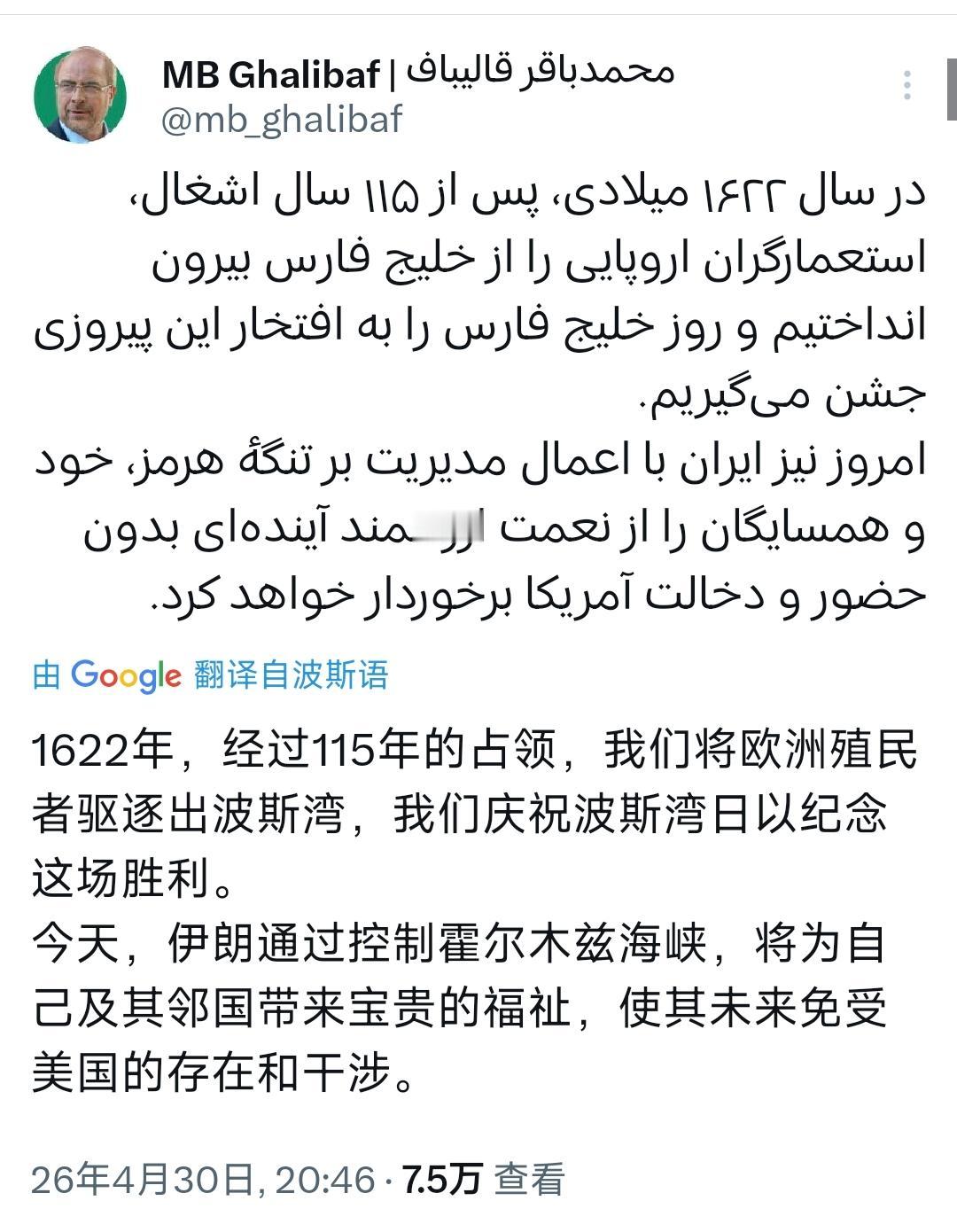 伊朗议会议长卡利巴夫今晚(4月30日晚)写道:“1622年,经过115年的占领,我们将欧洲殖民者驱逐出波斯湾,我们庆祝波斯湾日以纪念这场胜利。今天,伊朗通过控制霍尔木兹海峡,将为自己及其邻国带来宝贵的福祉,使其未来免受美国的存在和干涉。” [机智]评几句:卡利巴夫在“波斯湾日”将1622年驱逐葡萄牙殖民者的历史叙事,嫁接至当下“控制霍尔木兹海峡”的地缘博弈,本质是一场高强度的防御性舆论战。此举旨在用“反殖民”的道德大旗对冲美方压力,并将海峡管控这一极具争议的行为,包装为“为邻国带来福祉”的正义之举,试图在国际舆论场重塑合法性。尽管伊朗在军事与外交层面展现了战略韧性,成功将冲突拖入僵持阶段,但未来的真正考验已从战场转向国内。长期制裁与战争消耗正急剧透支民生基础,伊朗政府若无法将这种“地缘抗压能力”转化为民众可感知的经济红利与社会福祉,内部维稳的压力将远超外部威胁。伊朗的韧性不仅在于能管控海峡多久,更在于政权能否回应街头巷尾对面包与就业的迫切诉求。