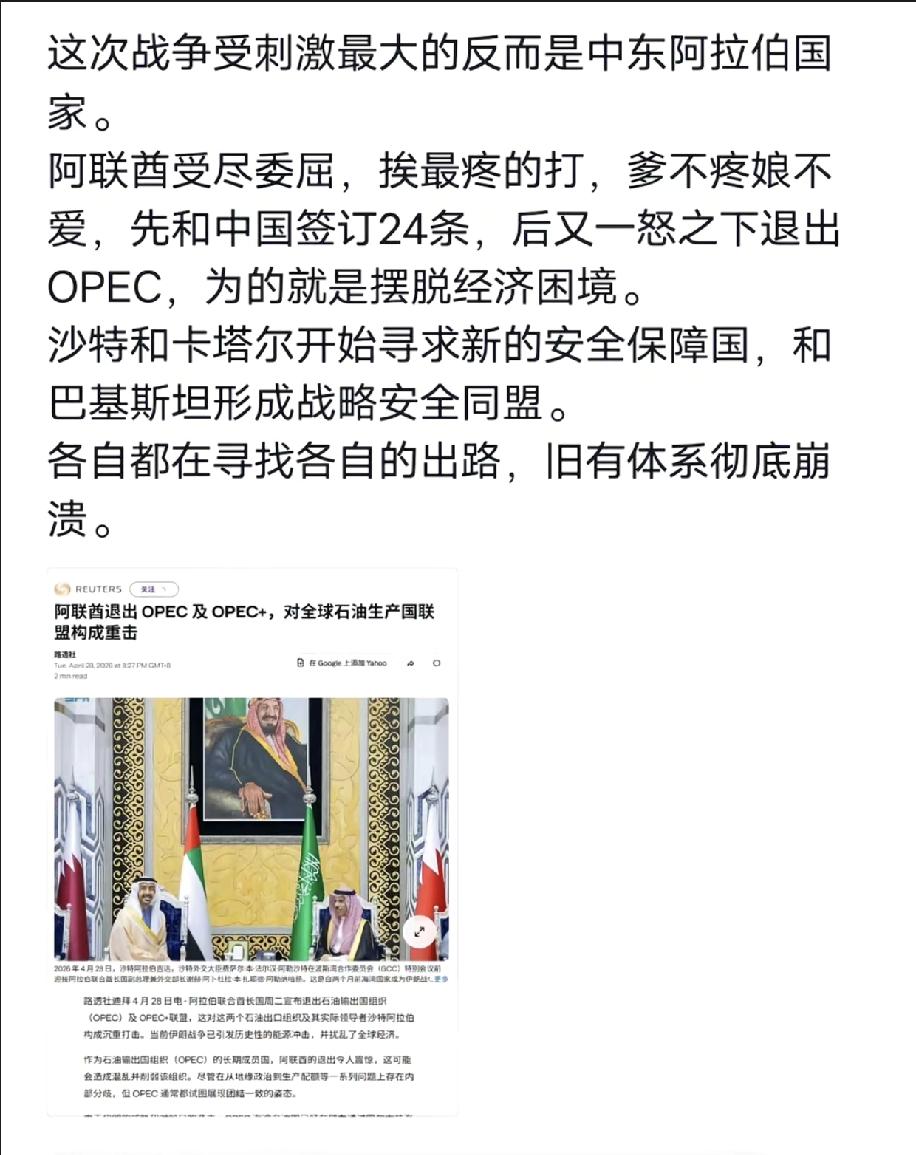 阿联酋和老美结盟,这次却挨了最毒的打,他们越支持老美,挨揍的程度越高,而旁边的沙特就不一样,对老美三星二意的,结果反倒没怎么挨揍,所以说跟着老美混,以后三天两头挨揍是常态,老美的盟友要习惯就好,世道变了。