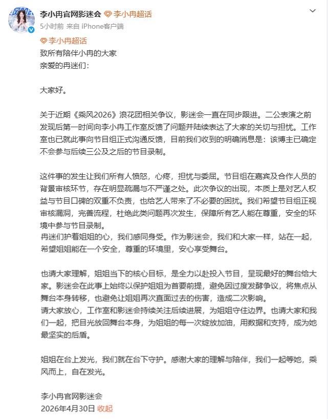 【李小冉方向节目组沟通结果曝光:浪姐争议评审已确认不再参与录制】4月30日,李小冉官网影迷会发文:关于近期《乘风2026》浪花团相关争议,影迷会一直在同步跟进。二公表演之前发现后第一时间向李小冉工作室反馈了问题并陆续表达了大家的关切与担忧。工作室也已就此事向节目组正式沟通反馈,目前我们收到的明确消息是:该博主已确定不会参与后续三公及之后的节目录制。这件事的发生让我们所有人愤怒,心疼,担忧与委屈。节目组在嘉宾及合作人员的背景审核环节,存在明显疏漏与不严谨之处。此次争议的出现,本质上是对艺人权益与节目口碑的双重不负责,也给艺人带来了不必要的困扰。我们希望节目组正视审核漏洞,完善流程,杜绝此类问题再次发生,保障所有艺人能在尊重,安全的环境中参与节目录制。 也请大家理解,姐姐当下的核心目标,是全力以赴投入节目,呈现最好的舞台给大家。影迷会在此事上始终以保护姐姐为首要前提,避免因过度发酵争议,将焦点从舞台本身转移,也避免让姐姐再次直面过去的伤害,造成二次影响。请大家放心,工作室和影迷会持续关注后续进展,为姐姐守住边界。也请大家和我们一起,把目光放回舞台本身,为姐姐的每一次绽放加油,用数据和支持,成为她最坚实的后盾。 洪朝阳确定不会参与浪姐后续录制