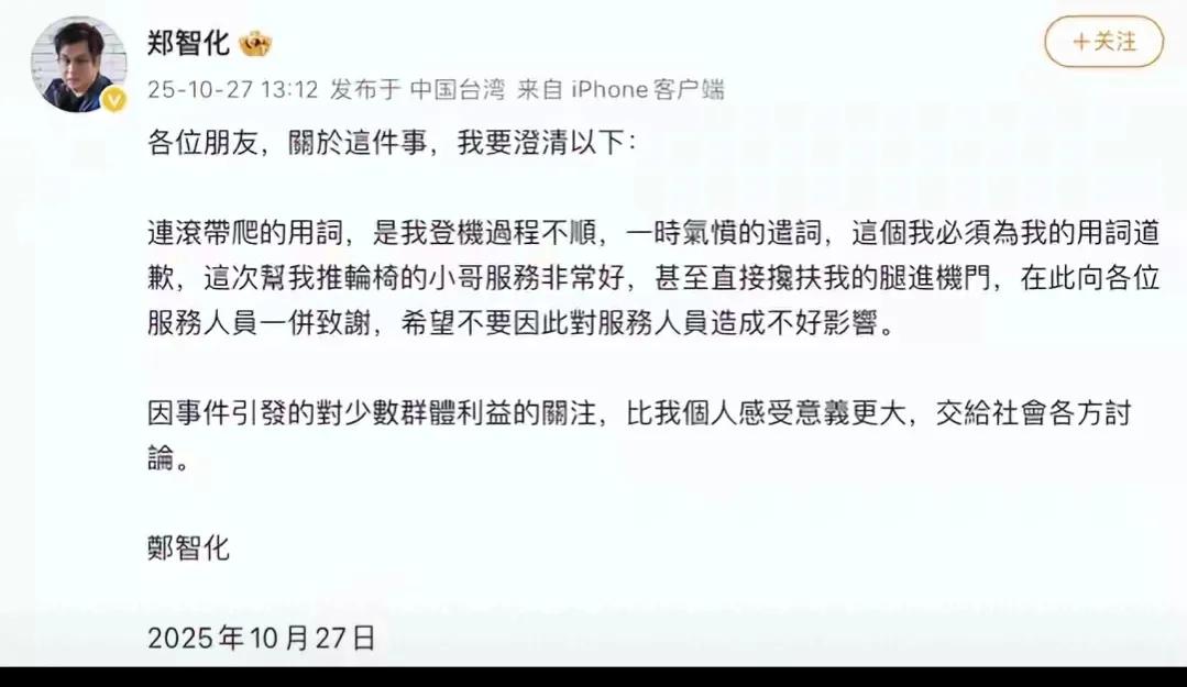 郑智化发文澄清并就用词道歉的态度,与其指责深圳机场和大陆之前的所谓“刁难”相比,