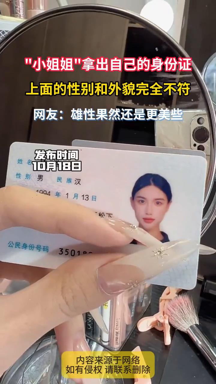 "小姐姐"拿出自己的身份证,上面的性别和外貌完全不符。 网友:雄性果然还是更美些