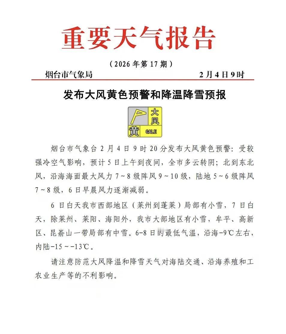据烟台海事局 烟台市气象台2月4日发布大风黄色预警,受较强冷空气影响,预计5日上