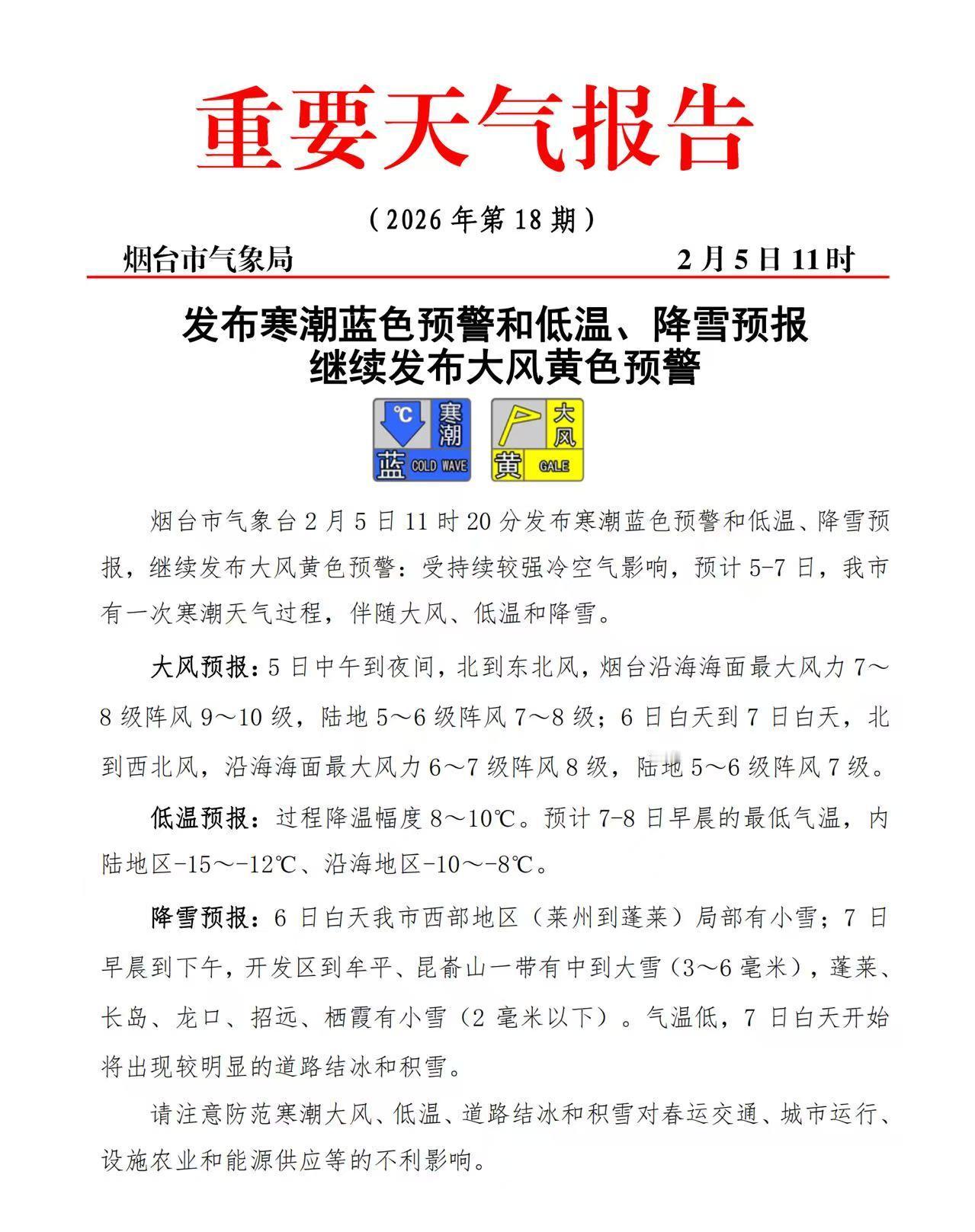 烟台市气象台2月6日11时继续发布寒潮蓝色预警:受寒潮影响,今明两天,我市将出现