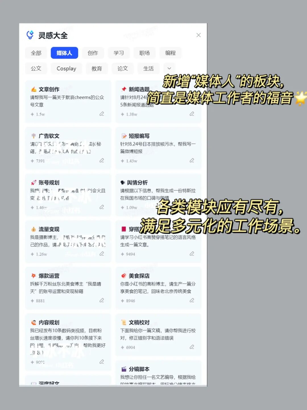 年度总结、会议致辞、演讲稿、即兴发言、策划书、通讯稿等等,这些过去费脑费时的工作,使用它以后,再也不用一个字一个字地想到头秃,也不用再去网上大面积地搜索又不精准的素材,只需输入几十字甚至几个字的指令,它就可帮你快速生成你想要的内容,至少节省超过三分之二的时间,真的没有夸张。而且现在它免费,使用次数无限,工作场景中的内容都可迅速转写,真的很香!最近它还上线了“媒体人”板块,很赞