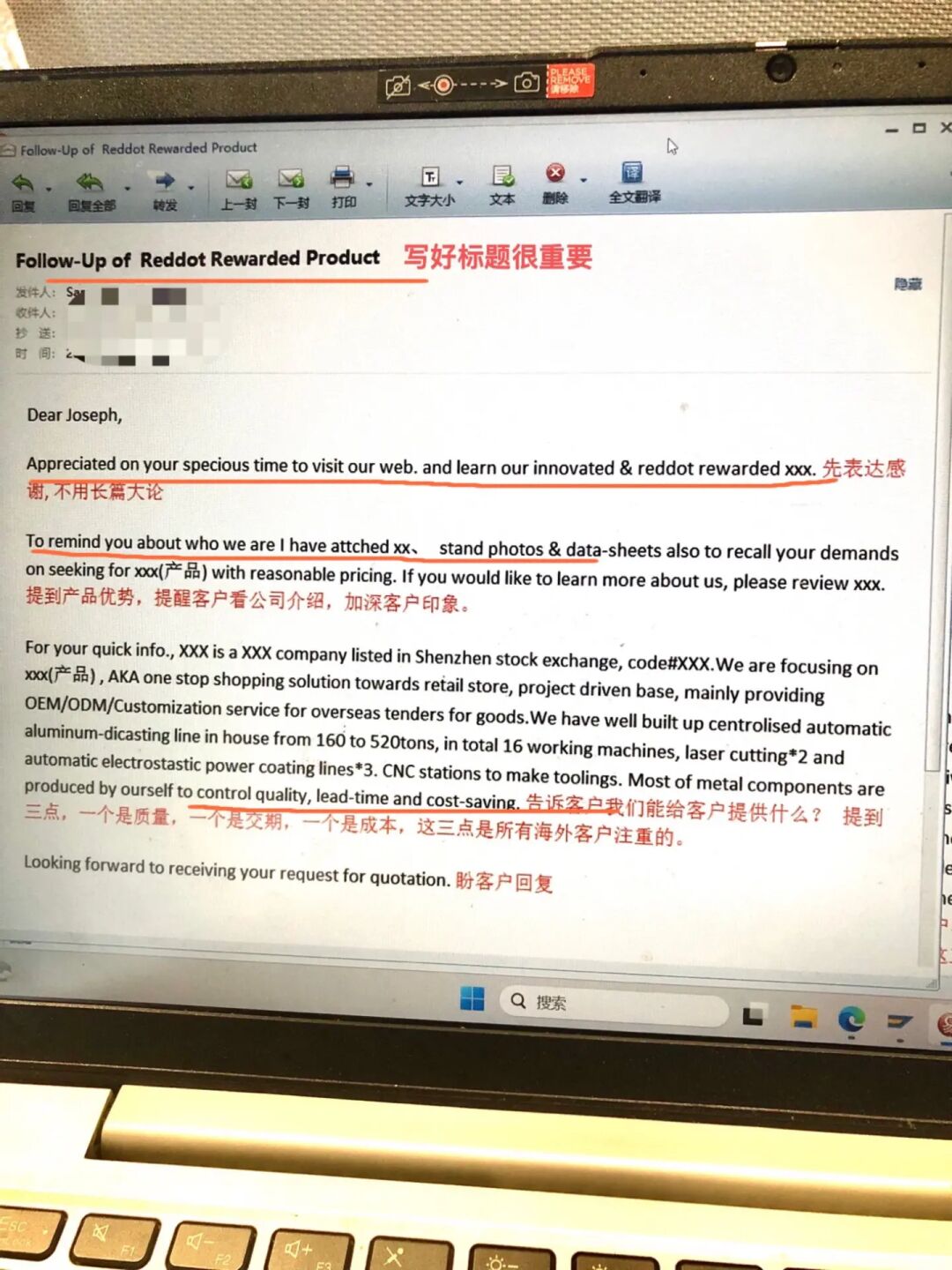 当时,他在国际站上看中了我们一个VR虚拟展厅里的展品。于是发了询盘,我给他们做了一个公司介绍跟产品介绍,向他要了电子名片。当天工作结束之后,我做了一件重要的事,✅对这个客户做了背调,✅然后再一次介绍自己,✅发感谢信给他。笔记后面我把我当时发的感谢信分享给你们参考。