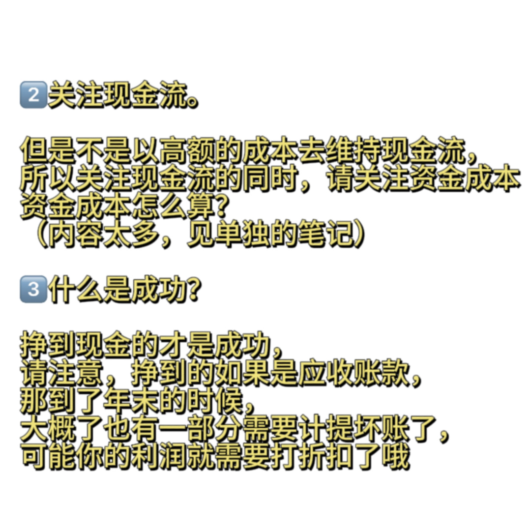 ③什么是成功,挣到现金的才是成功,请注意,挣到的如果是应收账款,那年末了,大概了也有一部分需要计提坏账了,可能你的利润就需要打折扣了哦