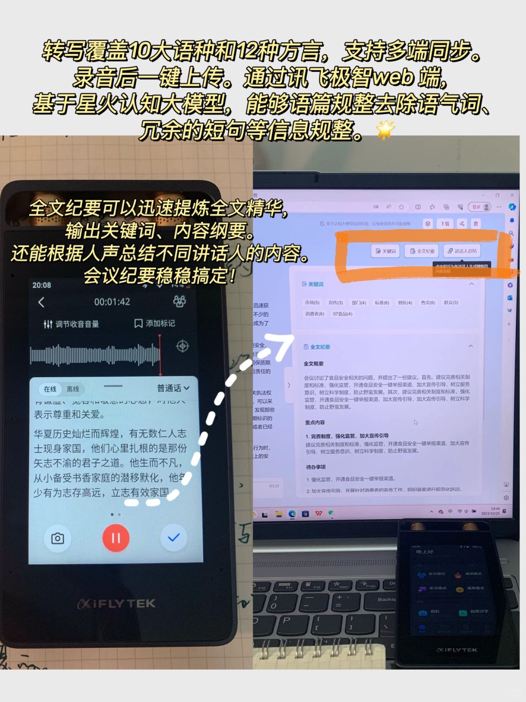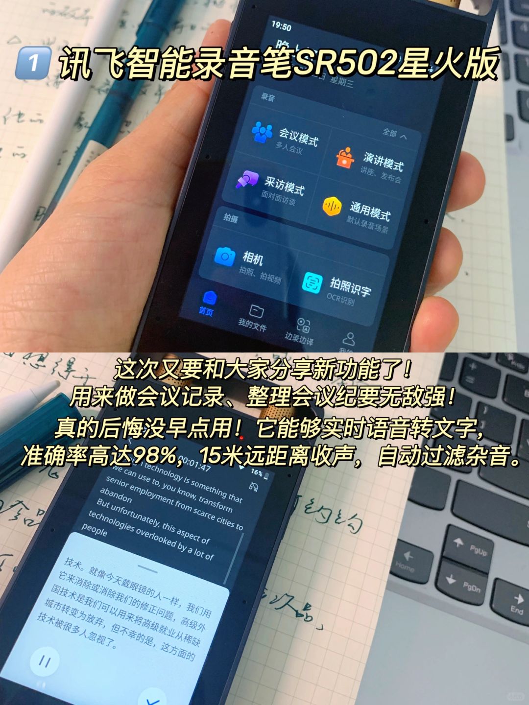 工作中我进步很快,最感谢的就是科大讯飞的智能录音笔!大家都知道体制内的工作,写材料内容是新人的必修课,而我刚换岗到材料岗时,经常要写会议记录,还要提炼成会议纪要,那时做新人根本什么都不懂,又怕做不好,经常弄得很紧张很崩溃,后来为了提高效率,经领导同意后用讯飞智能录音笔做会议记录。用后真的后悔没早点用!它能够实时语音转文字,准确率高达98%,15米远距离收声,自动过滤杂音。转写覆盖10大语种和12种方言,支持多端同步,录音后一键上传。通过讯飞极智web端,基于星火认知大模型,能够语篇规整去除语气词、冗余的短句等信息规整。几小时的录音资料秒提炼成精华,输出内容纲要,编辑一下就是高质量会议纪要!这大大解决了我当时的烦恼。科大讯飞是智能界 yyds!它的录音笔真的很神!而且如果你想学口语,或者出国旅行,SR502·还支持多国语言实时翻译,一机多用,而且这个产品一直在升级功能,早入手早赚到,这个产品做的好用心!!真的建议大家用起来!