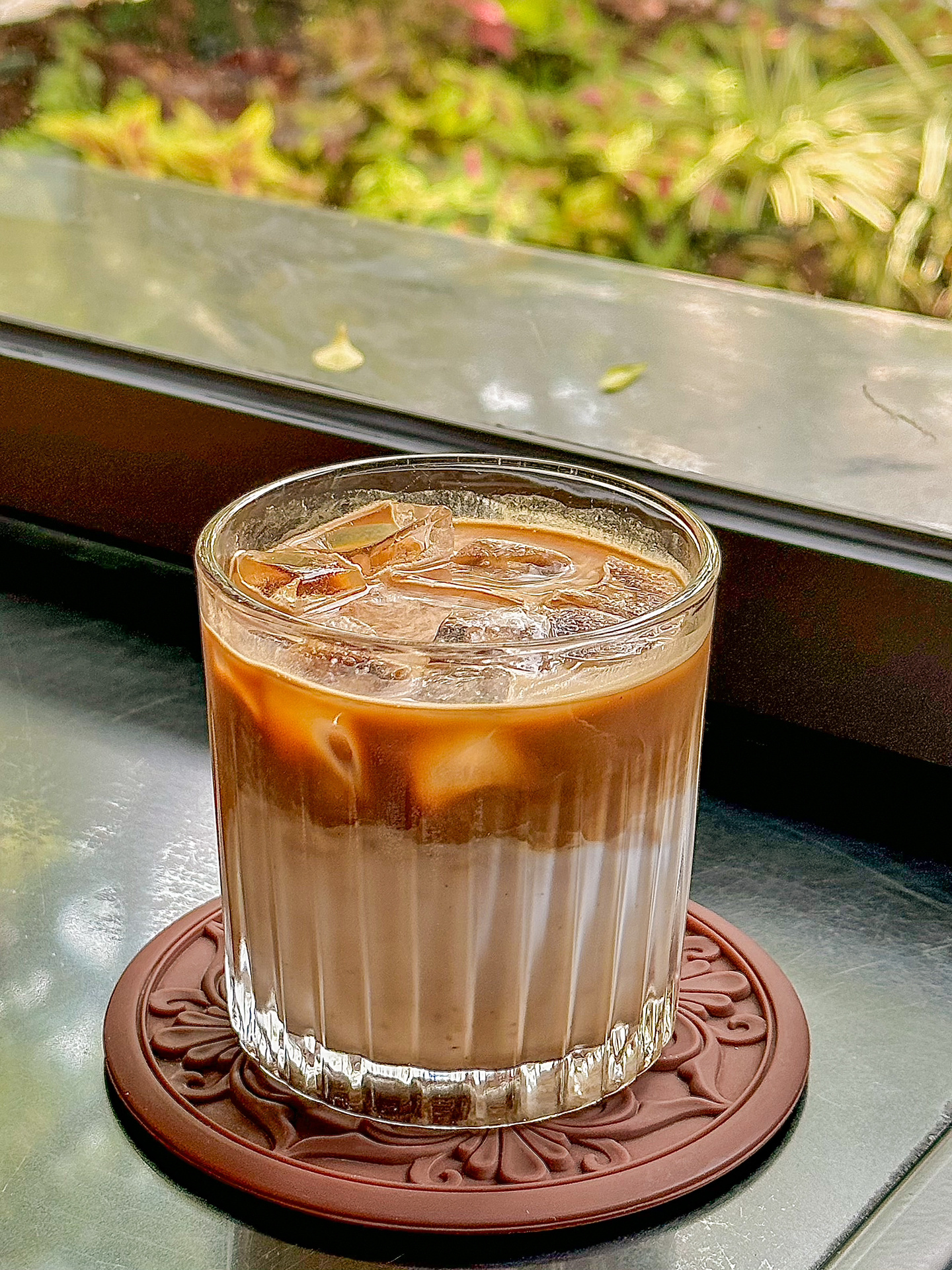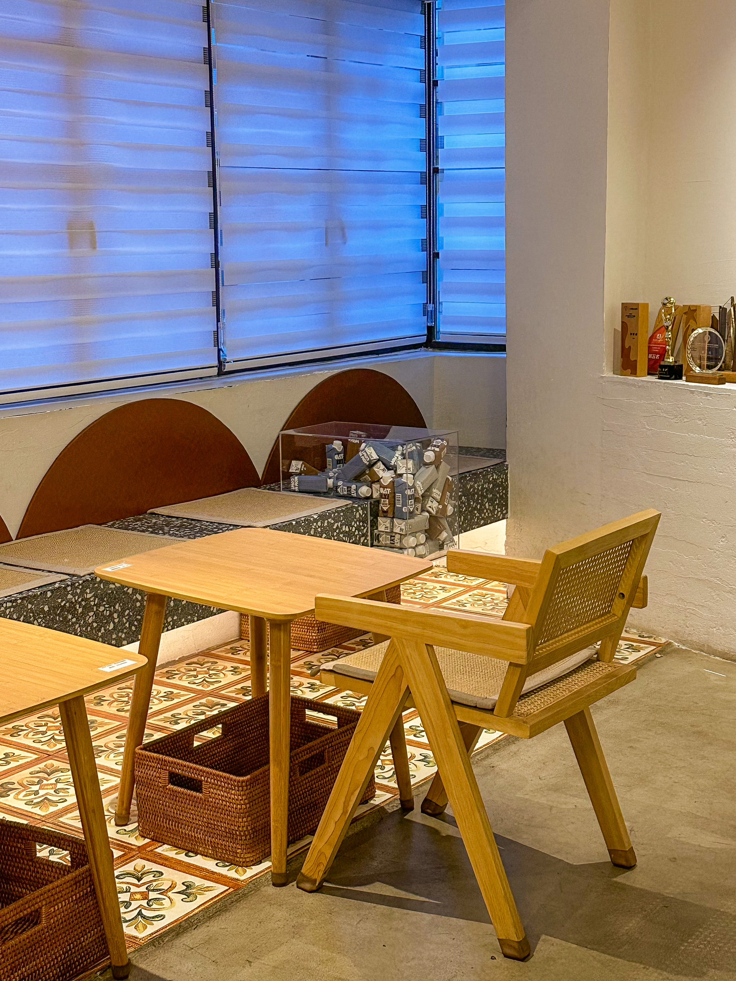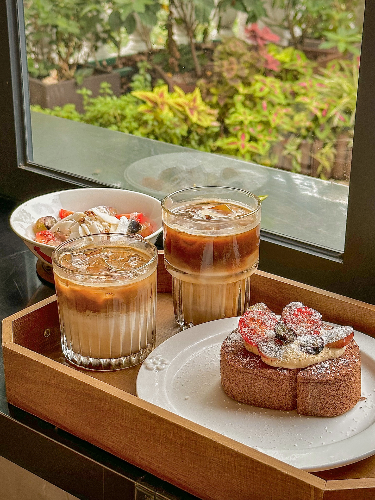 一共有三层楼,一楼是小庭院,二楼是烘焙工作室,三楼户外有一个大阳台,也是用餐区,光线嘎嘎好!点了两杯咖啡,一杯「燕麦拿铁」另一杯是「生椰拿铁」咖啡味都很浓郁,同时也能感受到燕麦和椰汁的醇香~