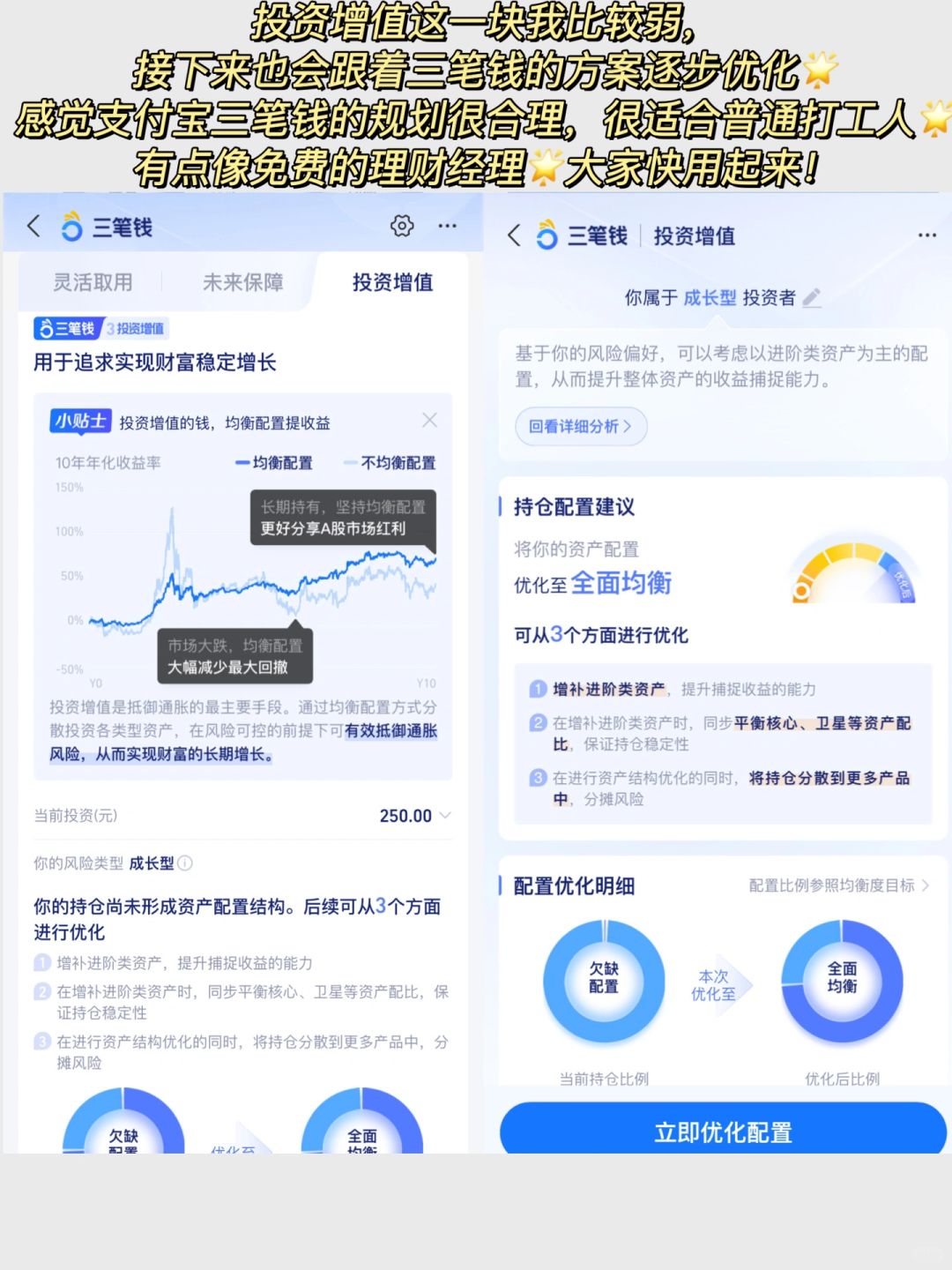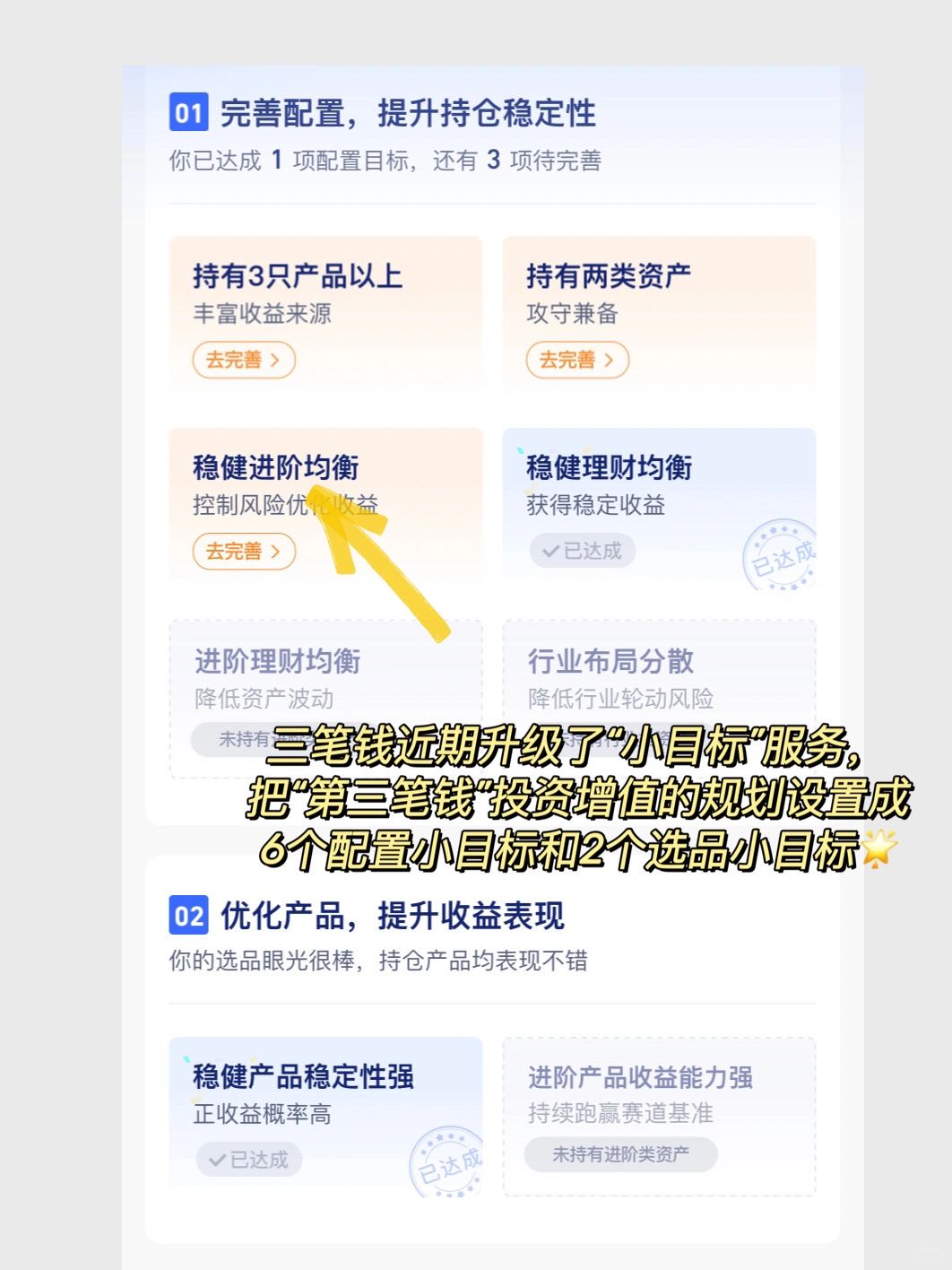 另外,三笔钱也在近期升级了“小目标”服务,把“第三笔钱”投资增值的规划设置成6个配置小目标和2个选品小目标,帮助我们一步步优化完善,我也会继续研究这部分,让理财投资更能抵御未知风险