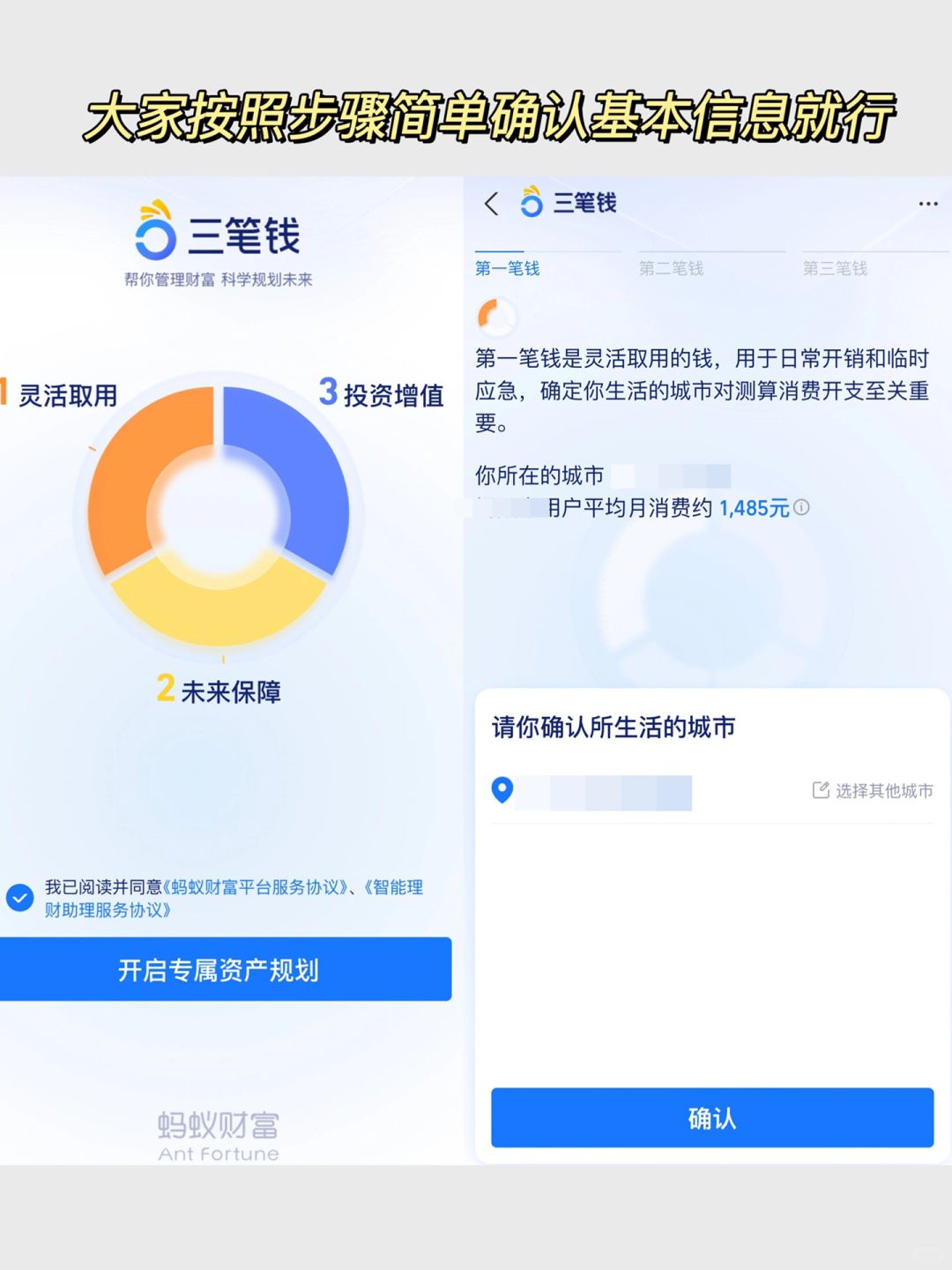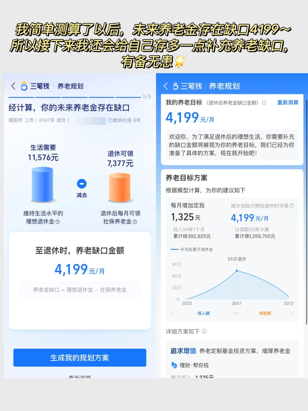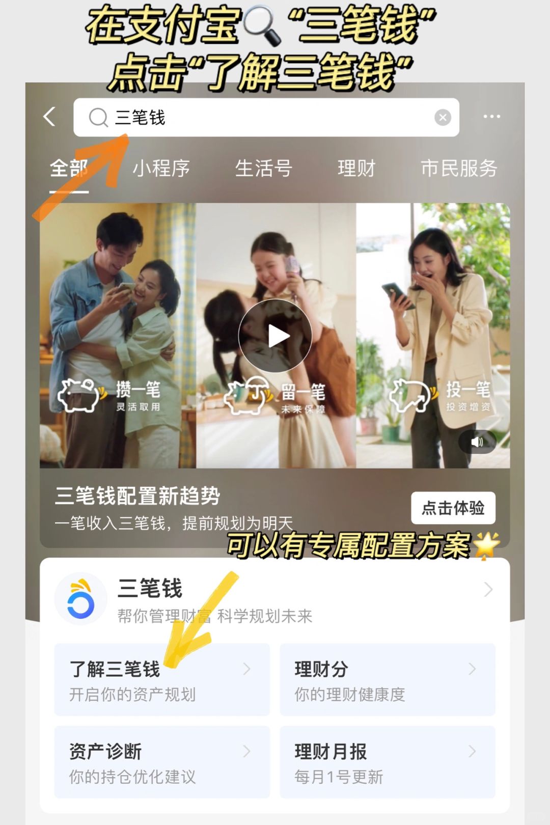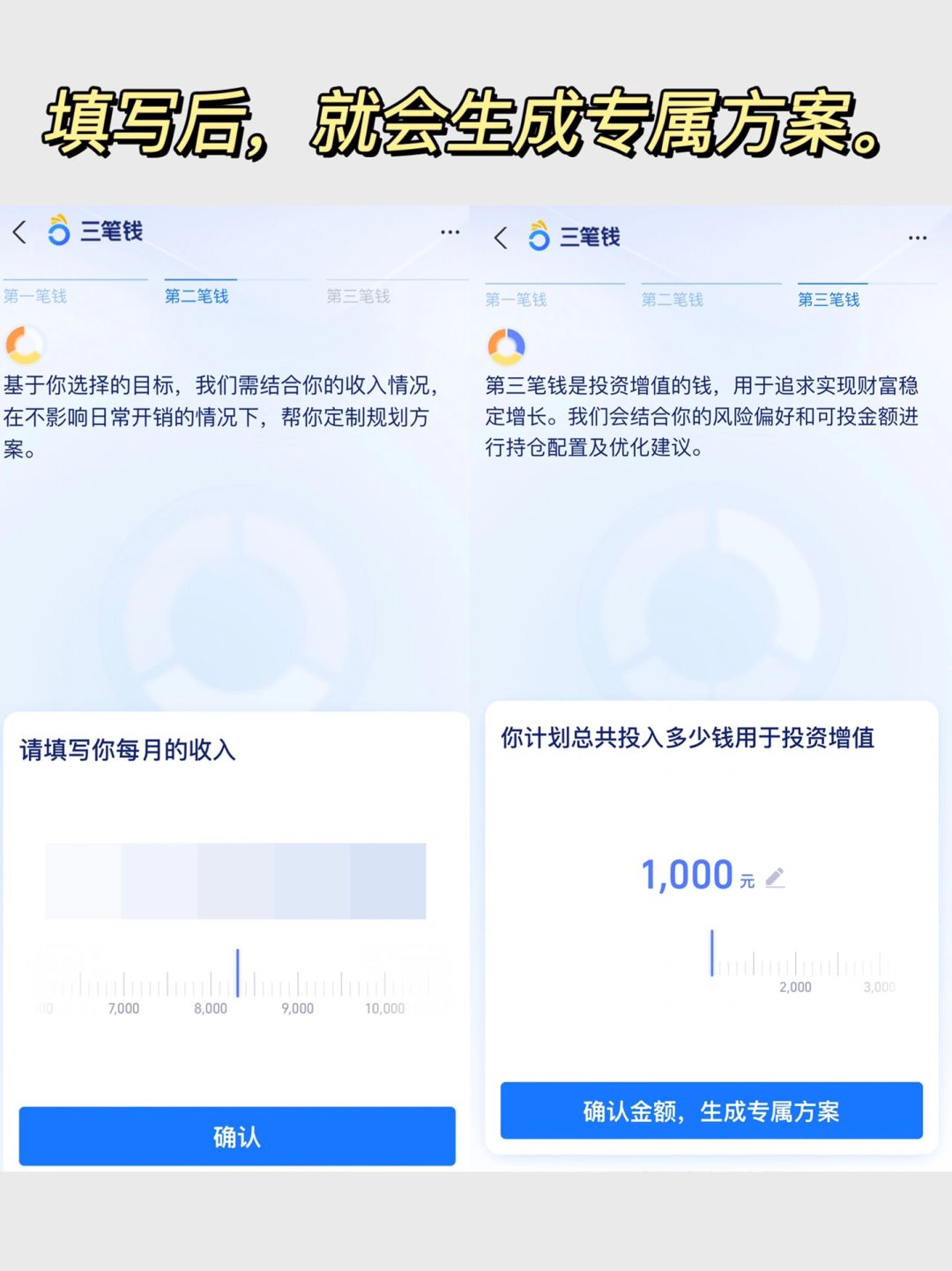这样既保障了稳定,也考虑了未知风险。如果大家觉得自己动脑筋比较麻烦,也可借助一些实用的小工具。比如可去支付宝app搜索“三笔钱”,跟我上面的存钱思路一样,我体验了觉得很合理!它也是把钱分为三笔:灵活取用+未来保障+投资增值,而且它会根据你所在的城市、现阶段的收入水平、子女情况等贴近实际帮你规划很符合实际的资金安排。我按照它的步骤测算了一下,退休后按照我的薪资水平,可以领到养老保险7k多, 但理想退休金是1w多/月,所以我还是要继续调整,从我现阶段的收入中再分配一部分补充未来养老金缺口。