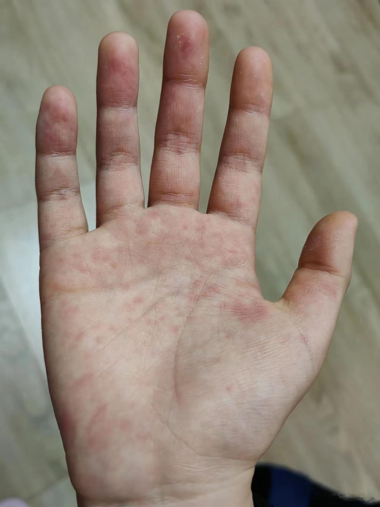 根据部位:手心;颜色:红;感受:痒。