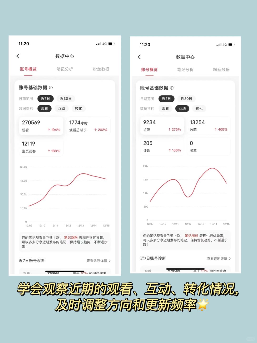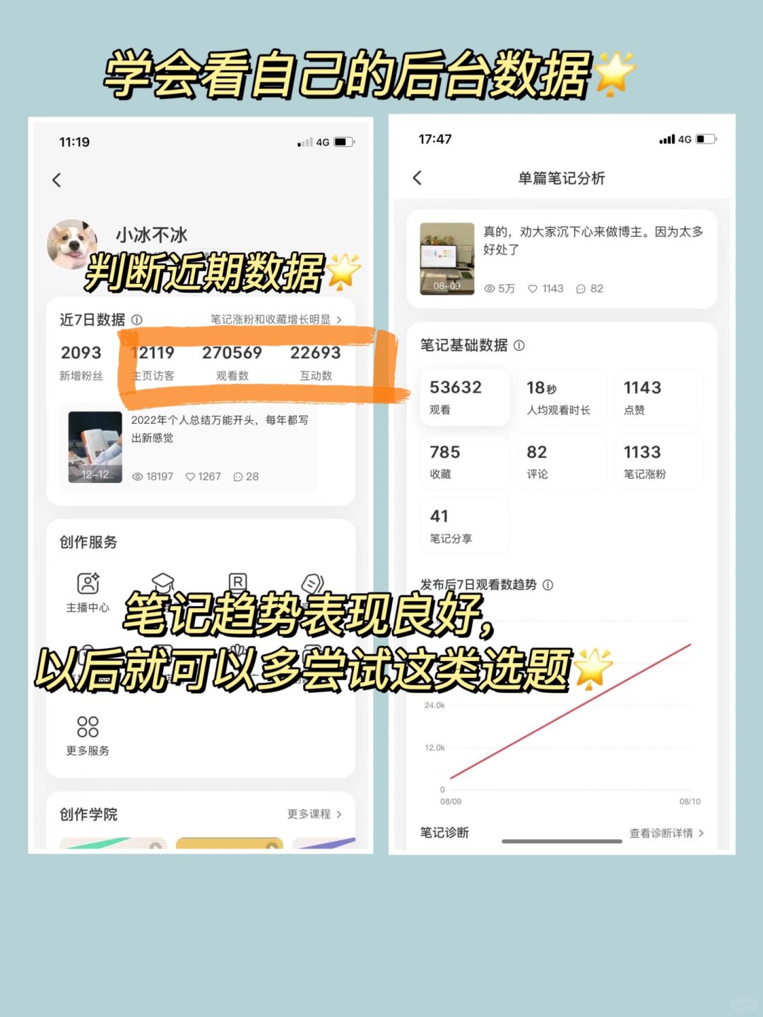 ▪️后台数据分析:做博主一定要学会观察后台数据,打开创作中心,看到“数据中心”,实时看到自己的数据概况,引导自己下阶段的创作方向。