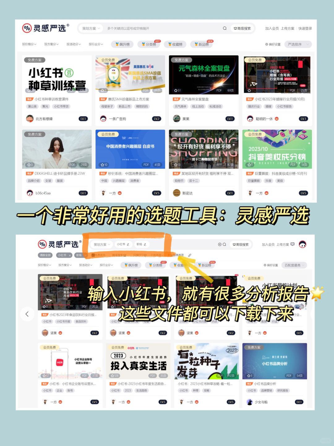 🔹选题:灵感严选——有非常多运营方案、行业报告,这些文件都可以下载下来!而且想写哪方面的选题就直接🔍,会有很多选题方向可以供我们参考,再也不担心选题枯竭了!是很好的自媒体入门好帮手。