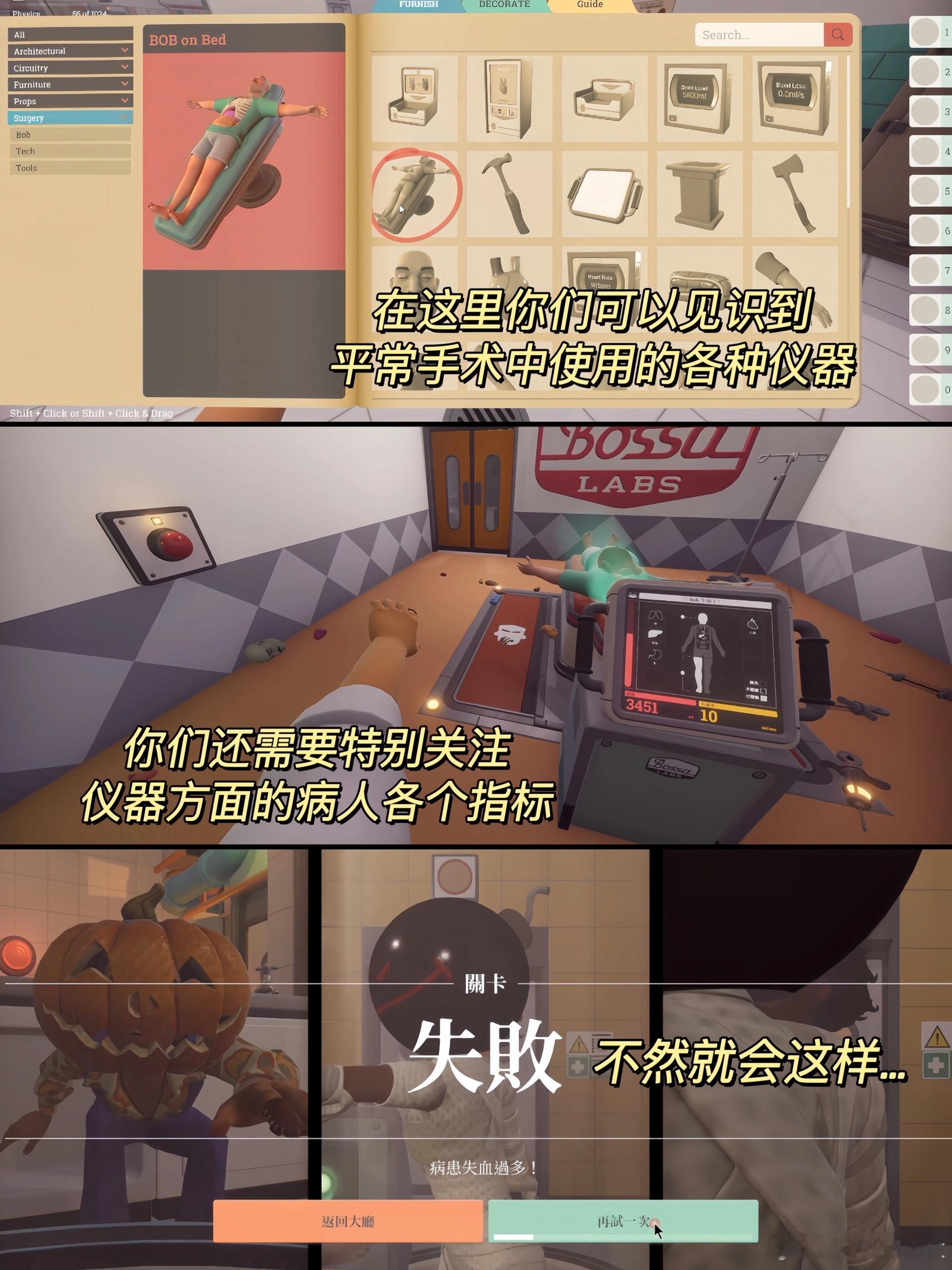 游戏介绍:Bob的生命掌握在你的手中!你需要穿上手术服,拿起最近的手术器件,进入Bossa Labs医疗设施,投身这款多人物理机制手术室的混乱狼藉中,你们将化身于整个医疗机构顶尖的医学人才,随着延续病人生命的压力不断提高,你们必须像精密的机器那样明确选择帮助或阻碍,在这个独一无二又群魔乱舞的派对游戏中为拯救生命而努力吧~[并不简单]