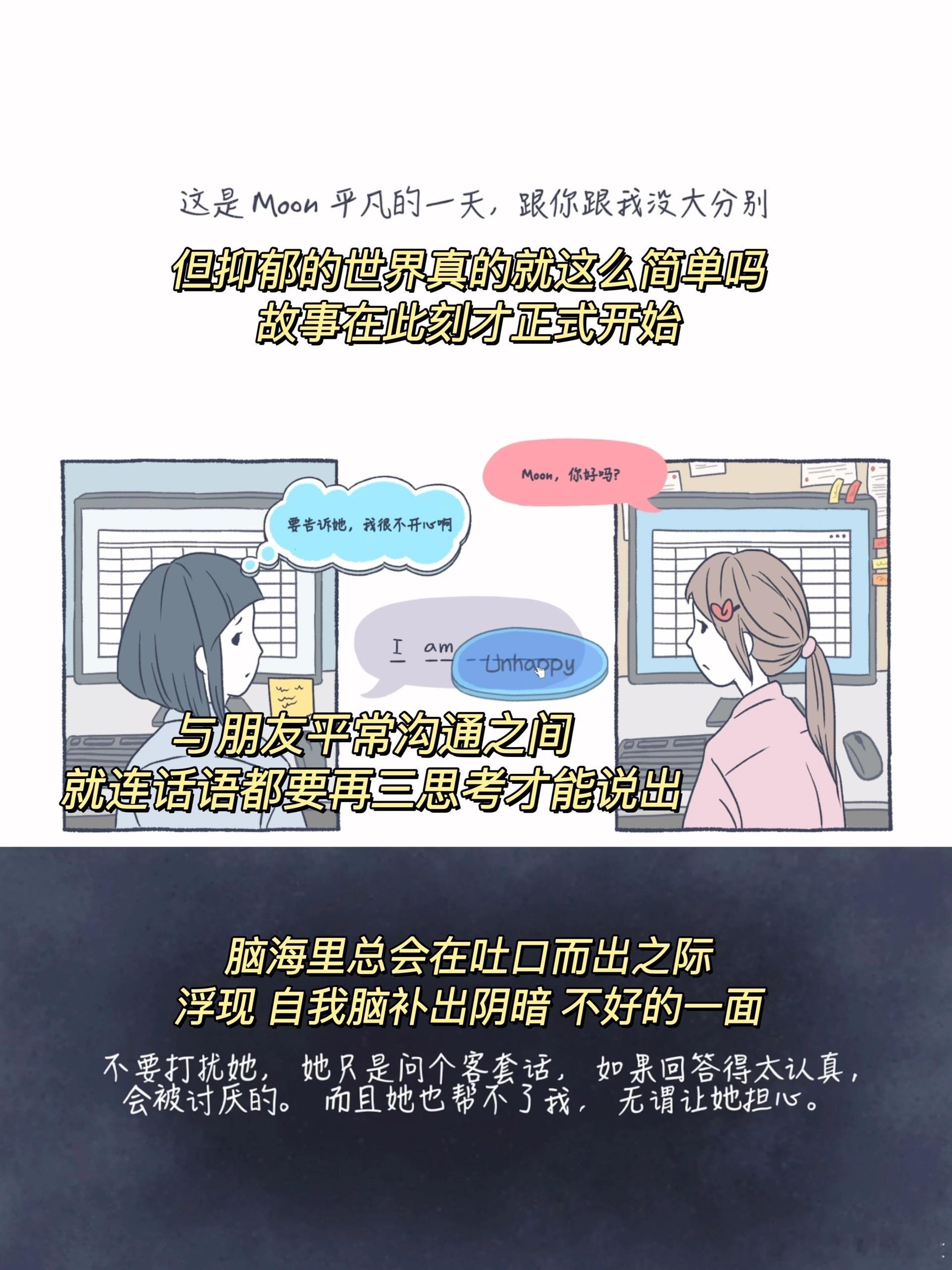Moon 是一位过着平凡OL生活的少女,过着一般城市人过的生活。但因为患上了抑郁症,她的反应和处理却跟一般城市人很不一样。女主的每次精神内耗,日常麻木且机械化般的三点一线,好像我们每个人的缩影[跪了]。