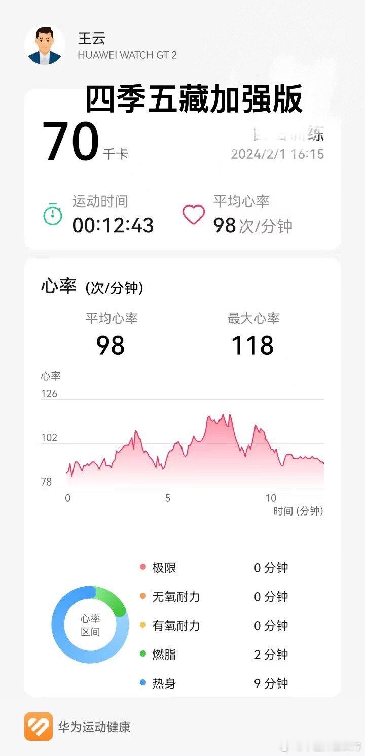 今天下午直播带练《四季五藏健身法五藏精简版》心率图如下,消耗热量91千卡。四点多又自己练习《四季五藏健身法加强版》,消耗热量70千卡。