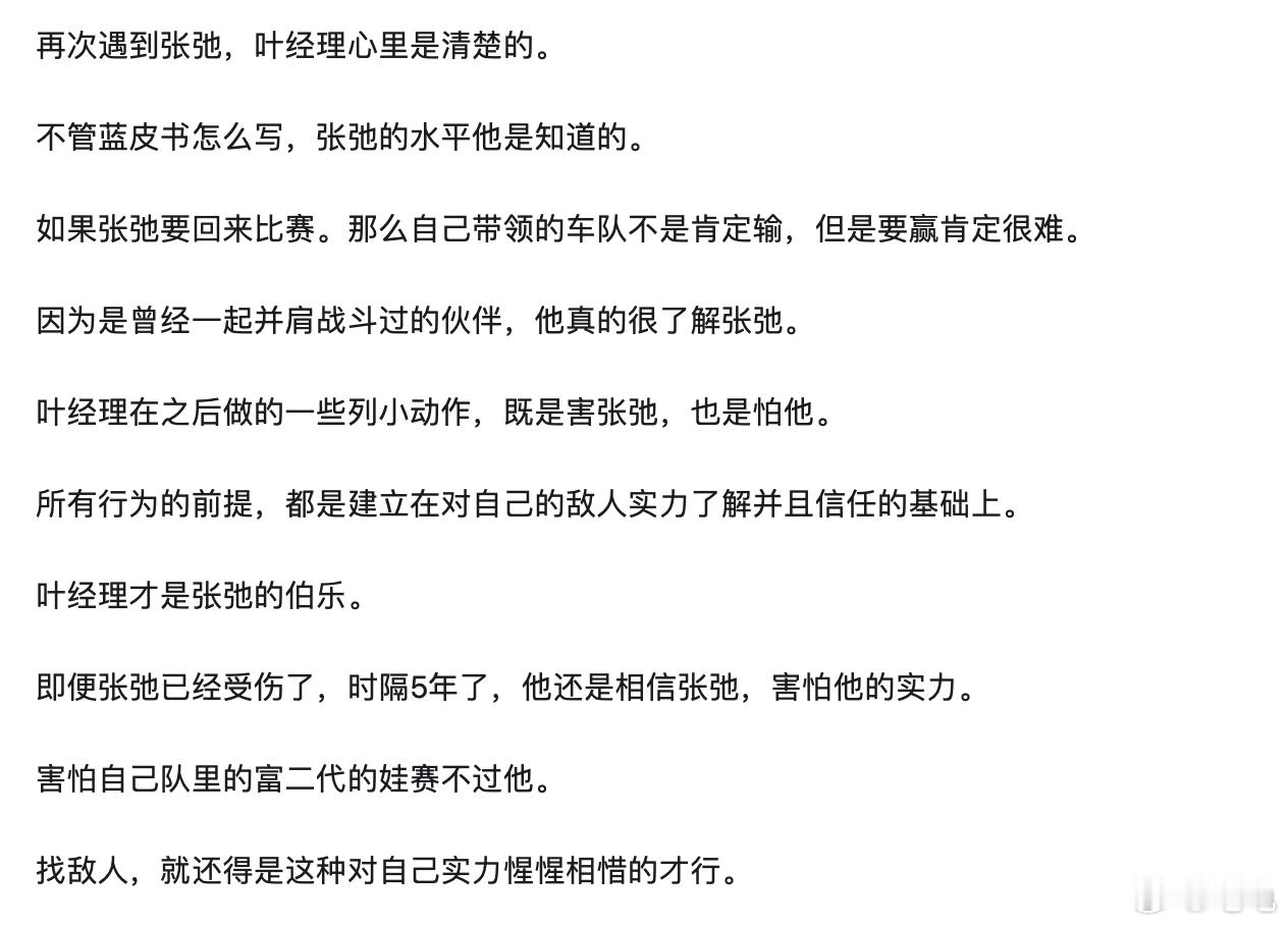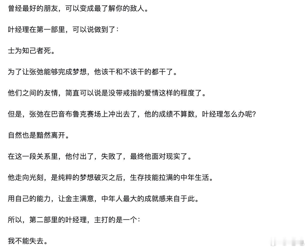 #张弛和叶经理是对照组##魏翔谈飞驰人生2#魏翔对叶经理的挖掘很透彻,怪不得韩寒要专门给他写这么一个“亦正亦邪”的角色,.他有能力有理想有抱负,也天真过,后来他做出了自己的选择。他在电影里不是一个好人,放在现实里他做的还算不上绝。他本身就代表了中年翻身可能碰到的阻力,但是也就他还相信张驰能行,脱离了单调的反派形象其实蛮有意思的人物设定。