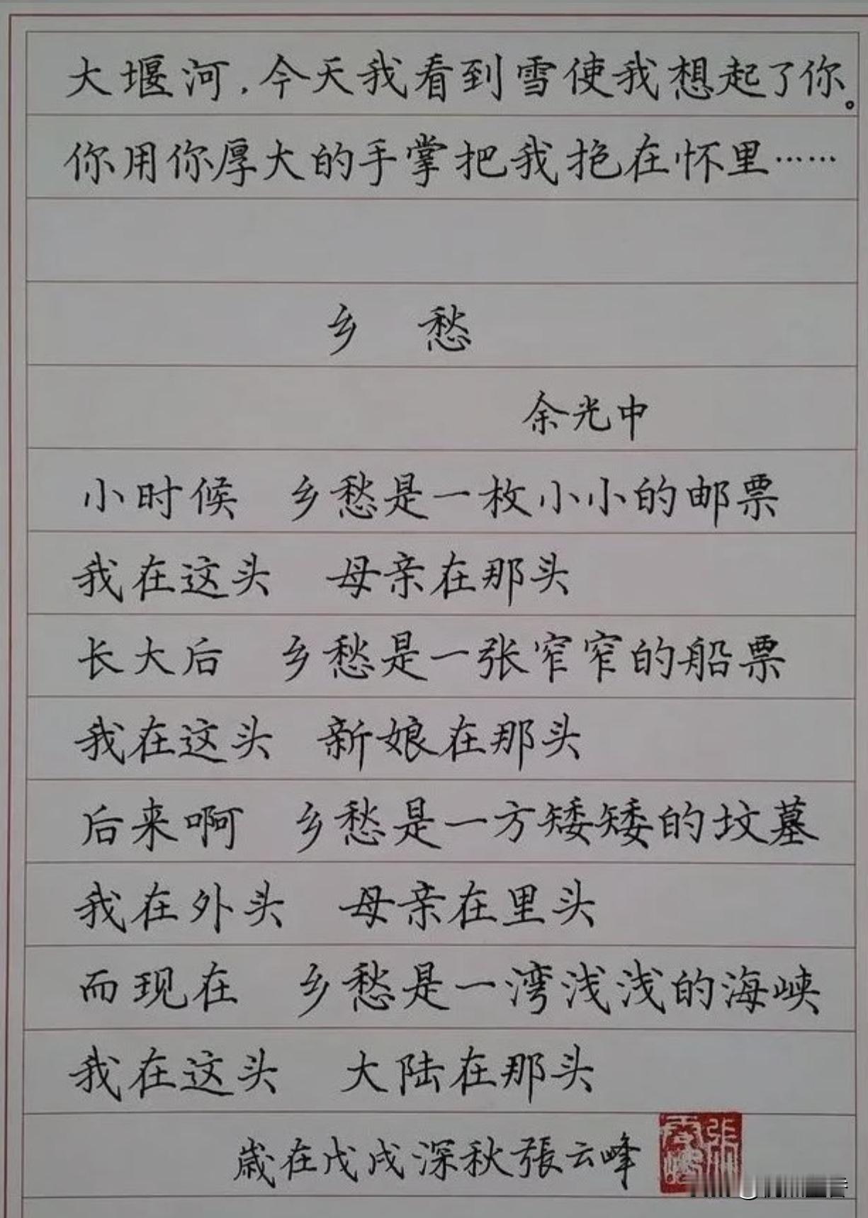 张云峰先生硬笔楷书,内容是艾青和余光中两位诗人的经典现代诗。 听说张云峰先生是硬笔书法比赛一等奖获得者,但不清楚是哪个层级的书法比赛,同名的书法家比较多。但这硬笔书法,确实比上世纪80年代、90年代很多硬笔书法家的水平强很多的!#硬笔书法##书法#