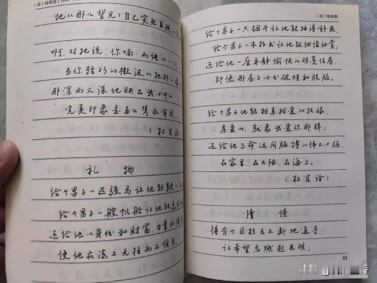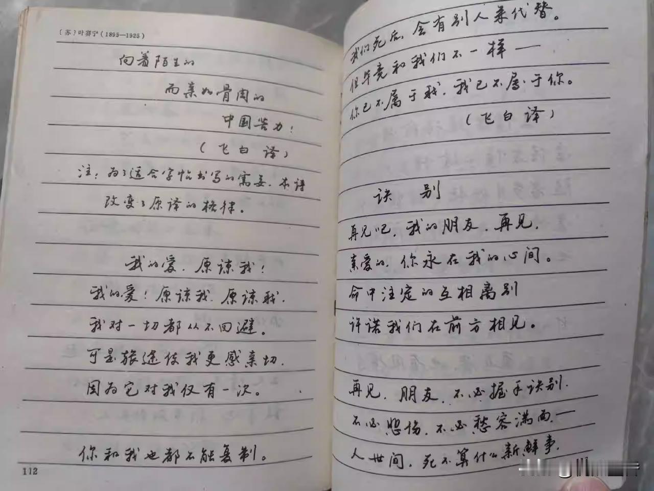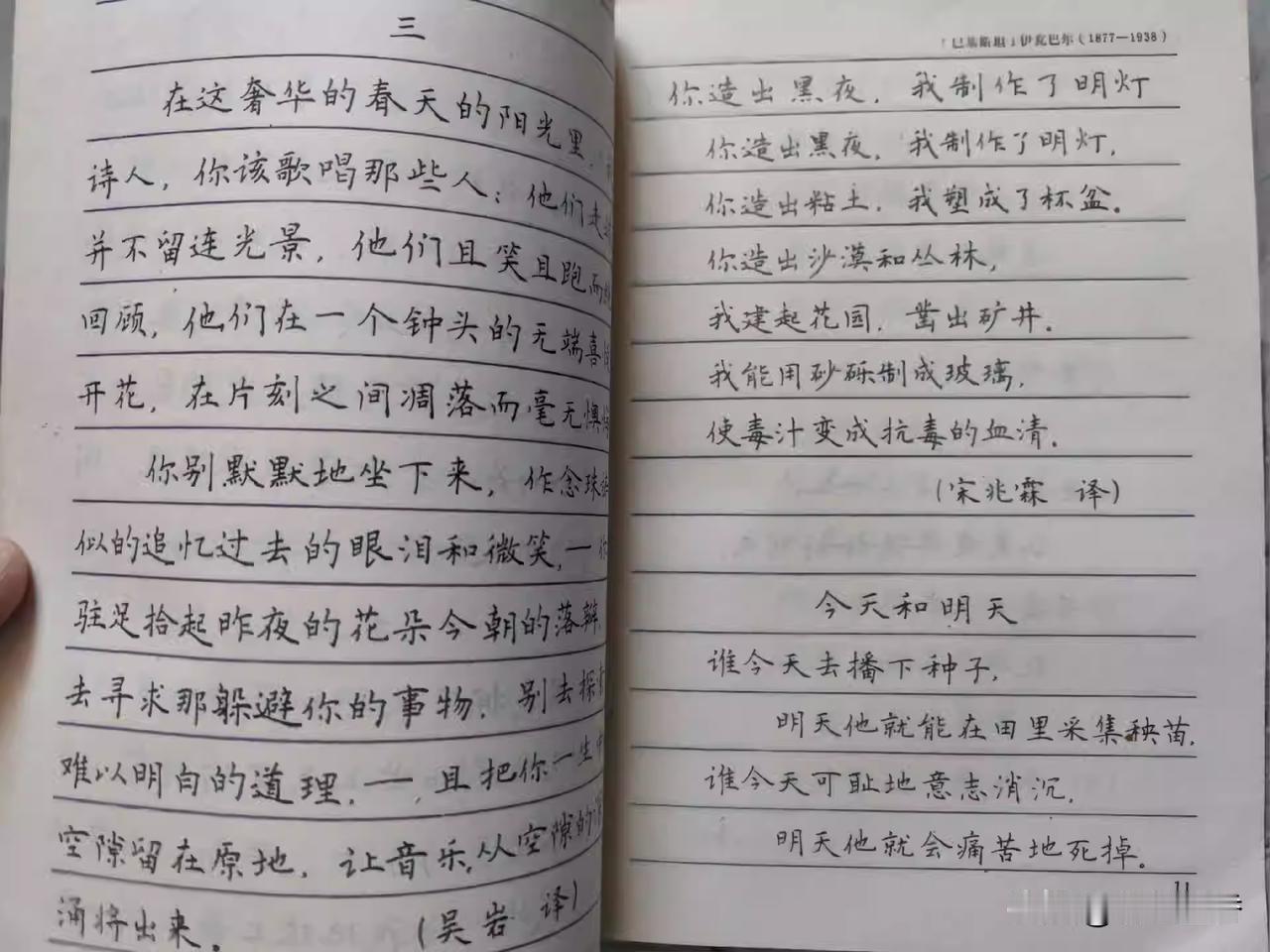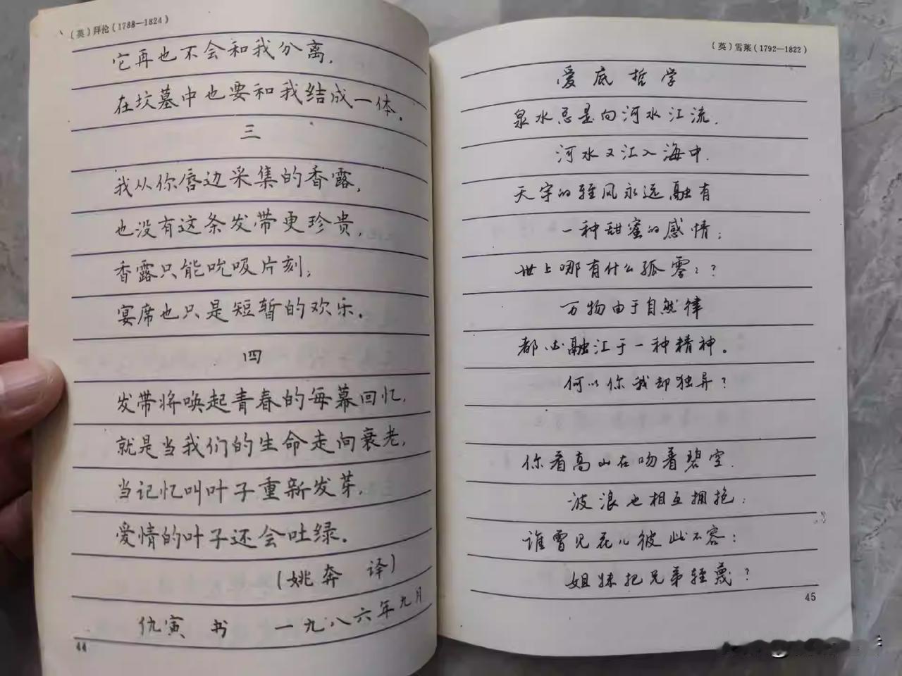 第一次见到,任平、仇寅1987年合写的《外国著名抒情诗钢笔字帖》,你的感觉如何? 他们两位可是首届全国硬笔书法大赛的特奖获得者![赞][赞] 任平老师的行书潇洒飘逸,禇体书法的气质满满;仇寅老师的楷书端庄大方,晋唐风格弥漫其间,两人珠联璧合,推出了这本字帖,可以见到两位书法家早年的书法风格! #书法欣赏##硬笔书法##书法##行书##楷书#