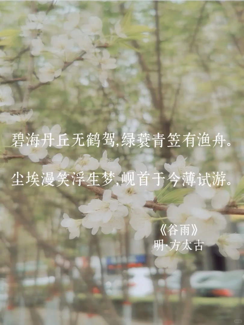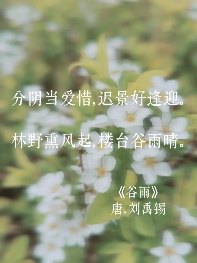 谷雨,春天的蕞后一个节气。 谷雨取自“雨生百谷”之意,此时降水明显增加,田中的秧苗初插、作物新种,蕞需要雨水的滋 润,降雨量充足而及时,谷类作物能茁壮成长。 —— 和大家分享一下谷雨的诗句~ 夏天就要来了! ——